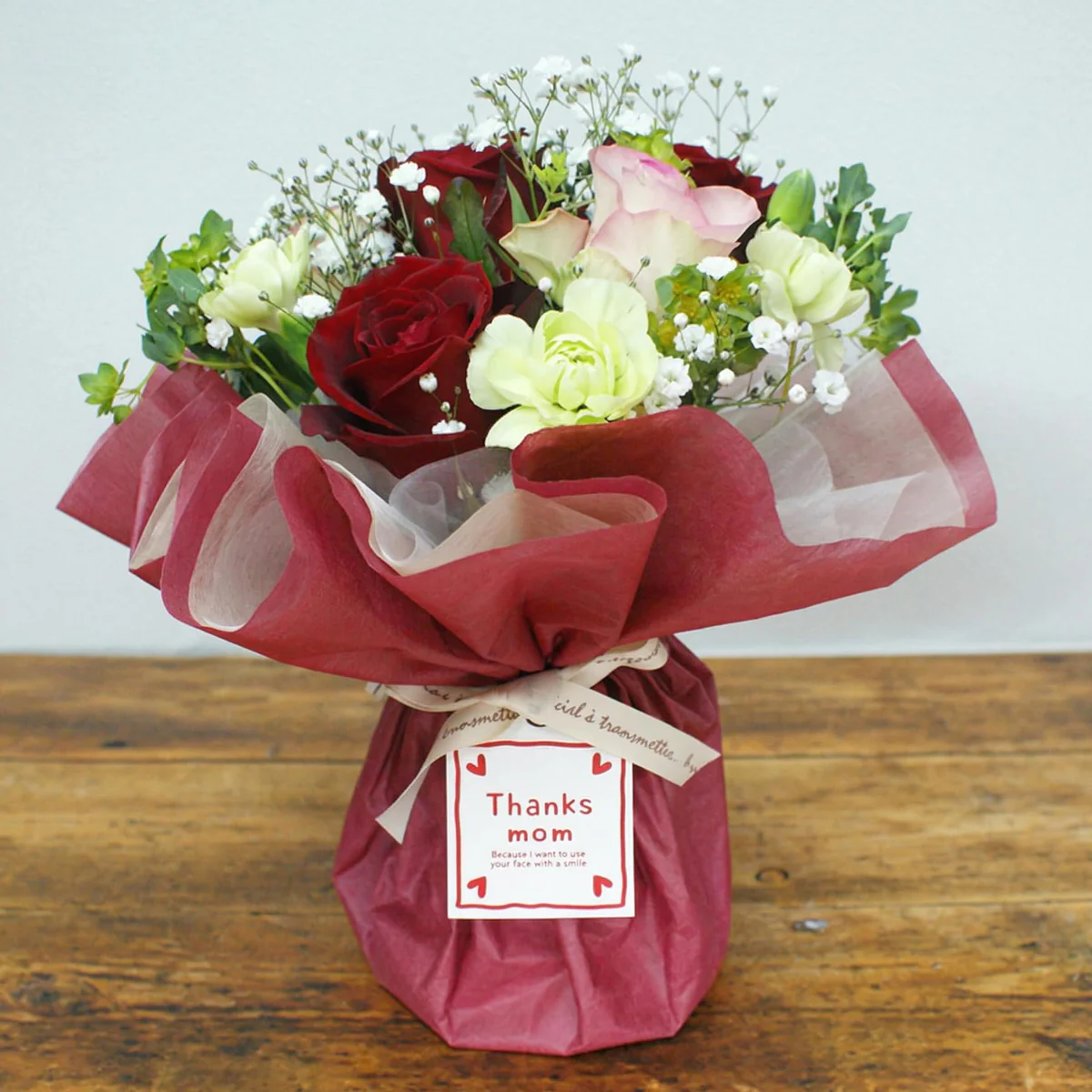 華やかに咲くバラが「ありがとう」をまっすぐに伝え、やさしい彩りと香りが癒しを届けます。