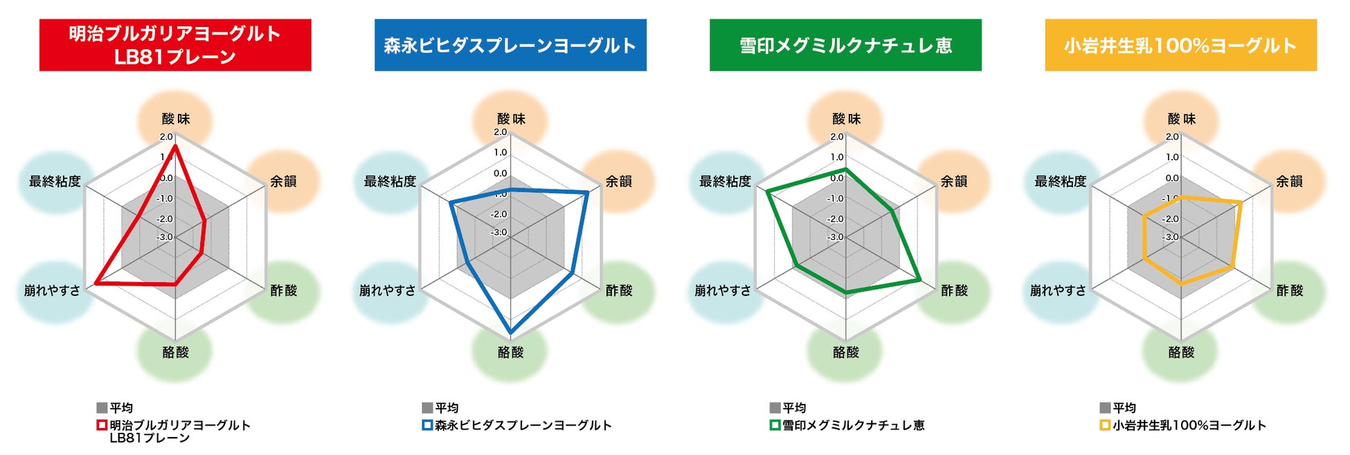 今回の分析では、4社のプレーンヨーグルト(明治ブルガリアヨーグルトLB81プレーン、森永ビヒダスプレーンヨーグルト、雪印メグミルクナチュレ恵、小岩井生乳100%ヨーグルト)を対象に検証を行いました。