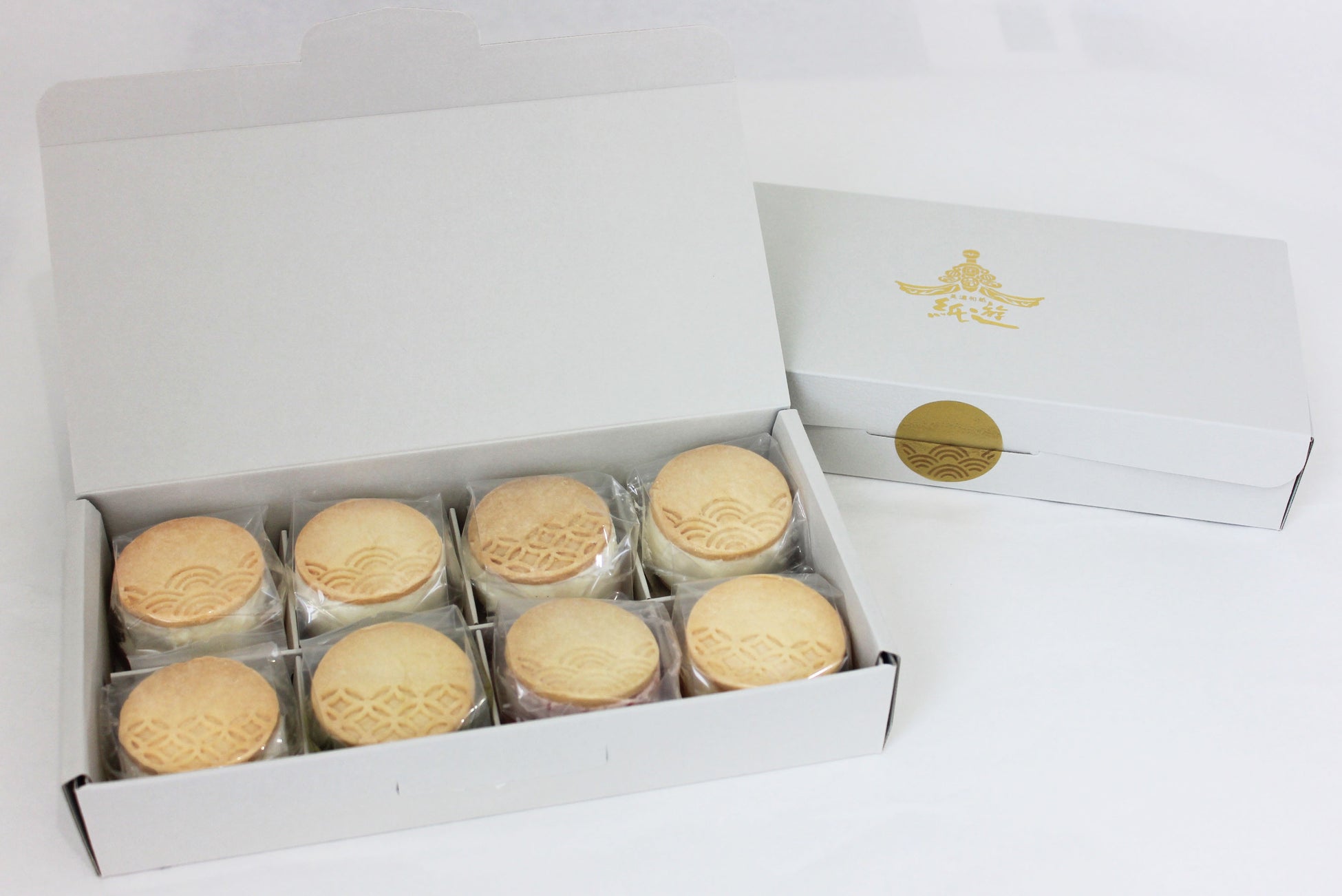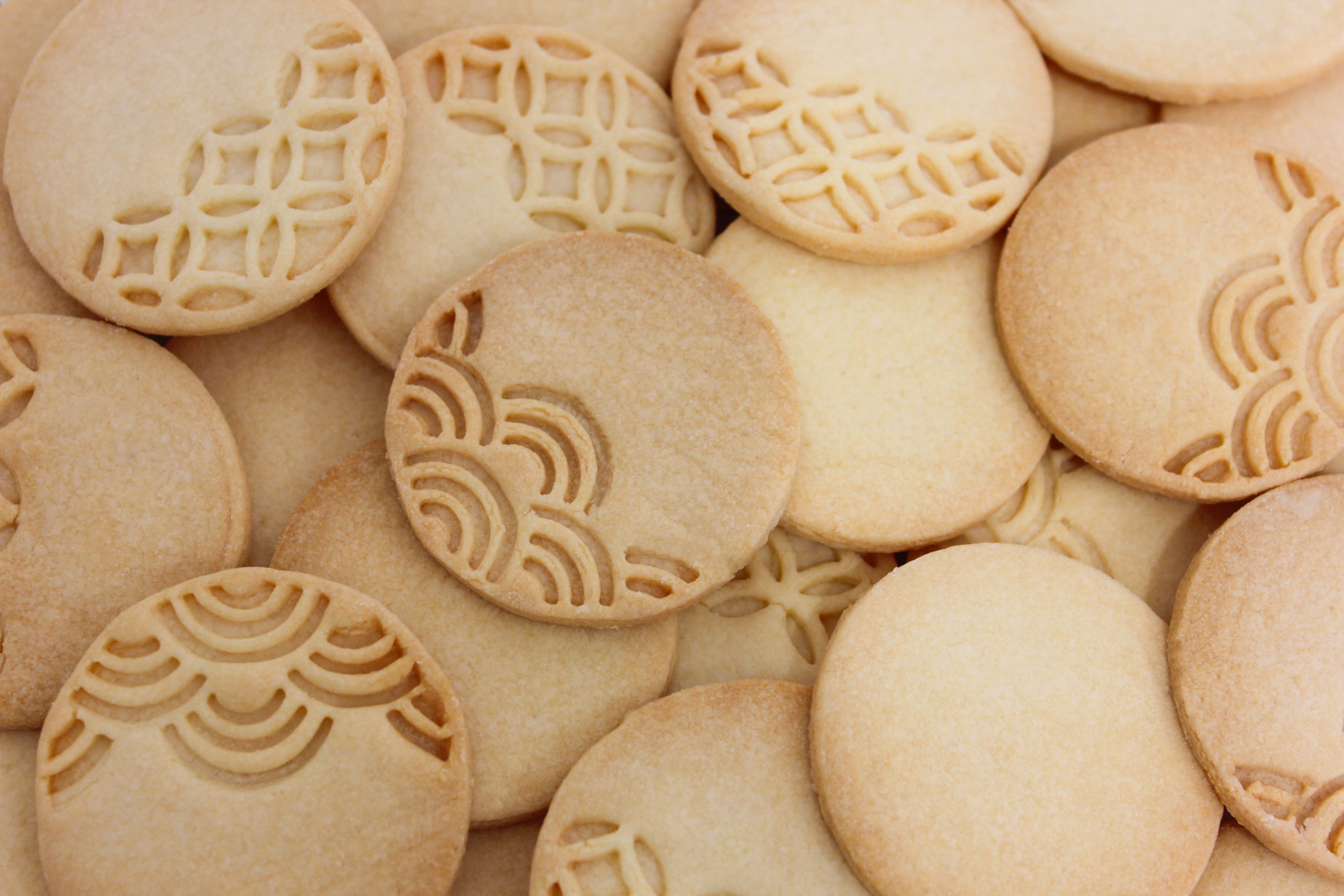 クッキーには、日本の伝統文様である「青海波」と「七宝」を刻印しています。 穏やかな波がどこまでも続くことから、未来永劫の平穏を願う「青海波」。 円が連なり広がることから、ご縁やつながりを表す「七宝」。