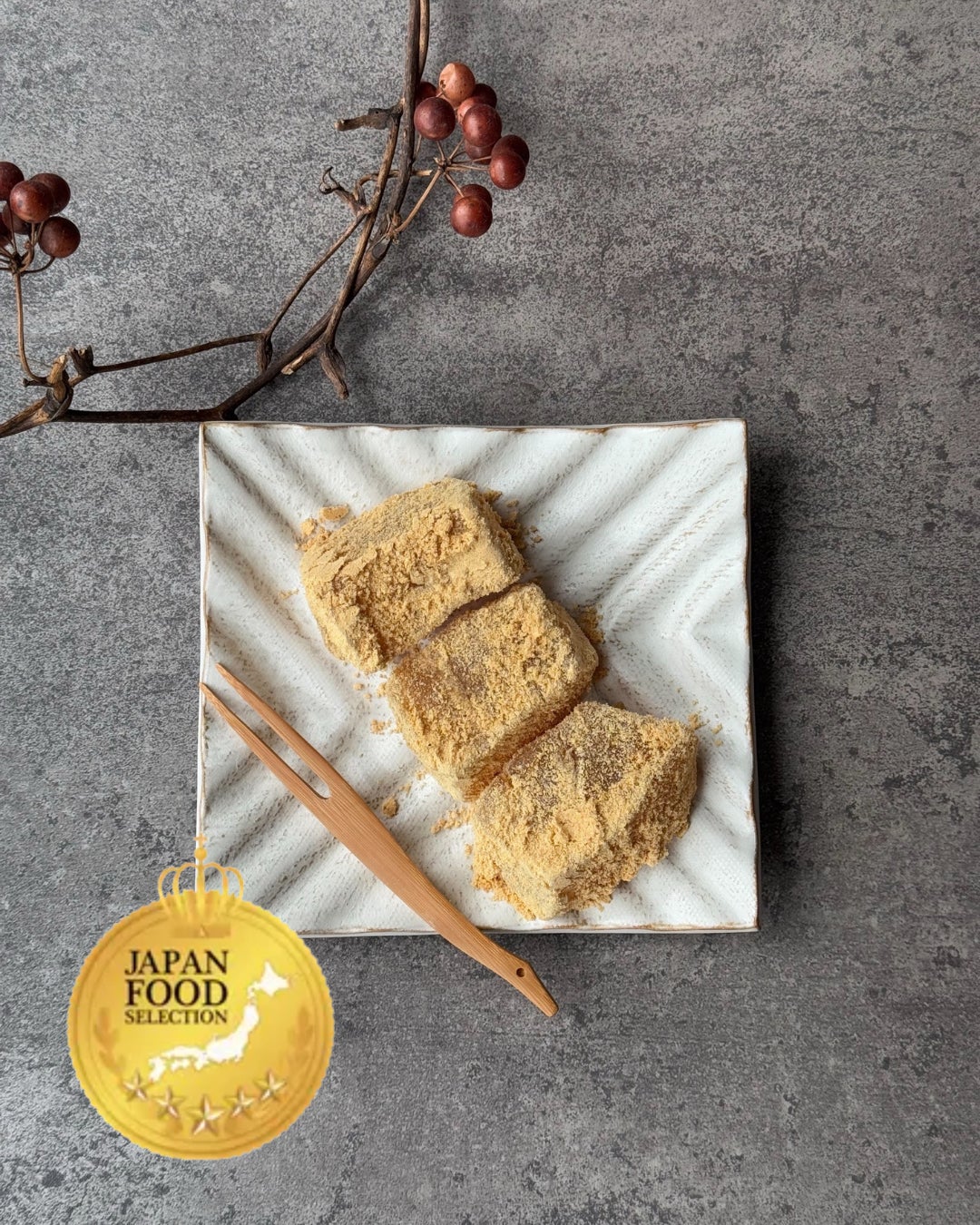 「ジャパン・フード・セレクション」とは、日本フードアナリスト協会に認定された2万3千人規模のフードアナリスト(食の専門家)が審査を行う、日本初の食品・食材の評価・認定制度です。日本人の繊細な味覚や嗜好性、食文化に配慮し、安全性やブランディングなど100のチェック項目に基づいて厳格に評価されます。 この度『名物 わらびもち』は、100点満点中90点〜100点を獲得した製品のみに与えられる最高賞「グランプリ」の栄誉に輝きました。