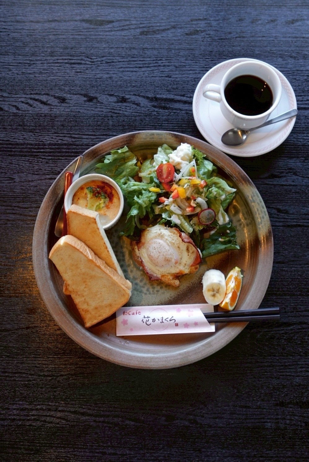 その名の通り、朝からパンにぴったり合うグラタンまでしっかり食べられる朝食ワンプレートです。朝の定番、トースト、ハムエッグ、サラダ、フルーツに追加で、グラタンまで食べられます。そして、コーヒーまたは、紅茶がセットに。