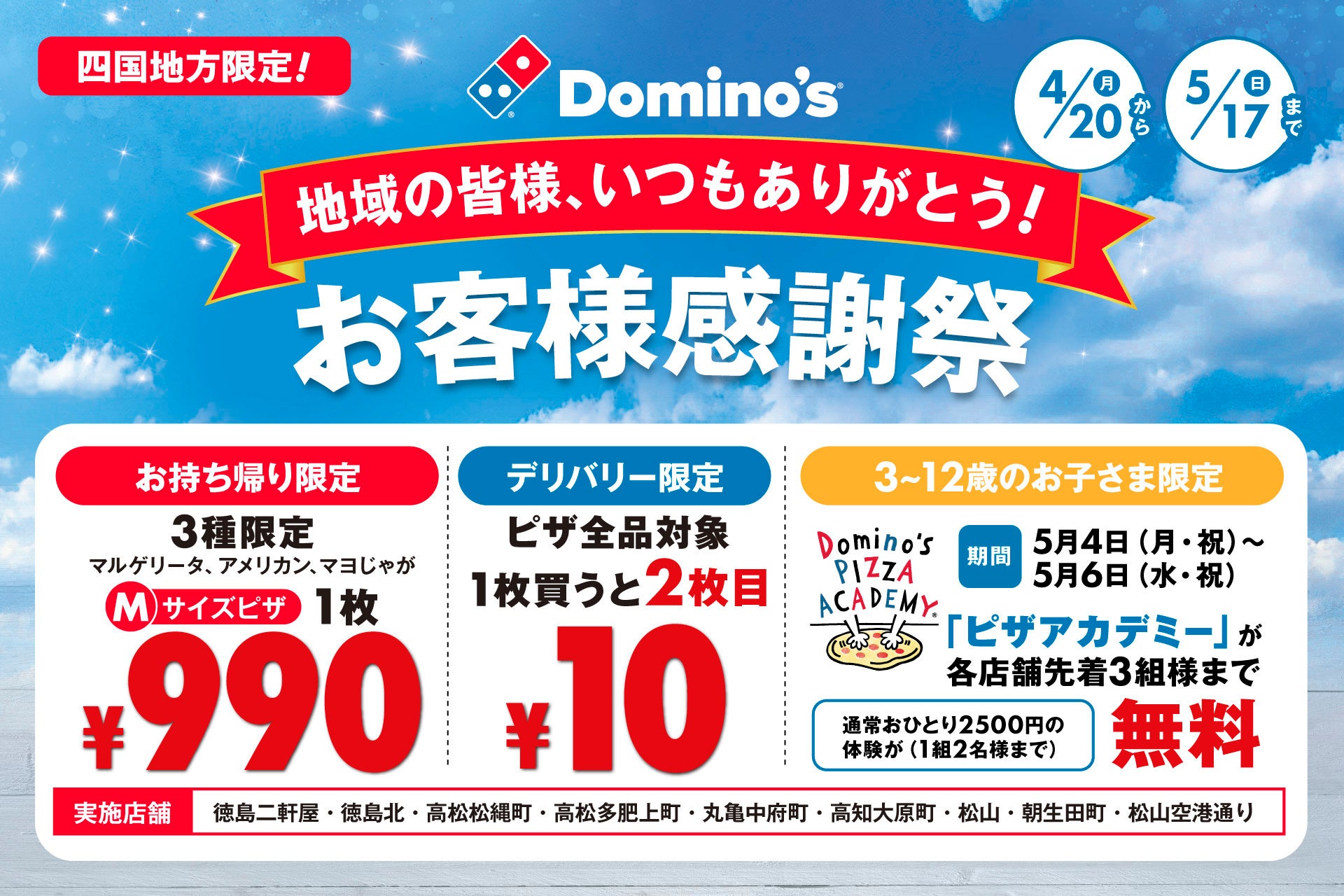 株式会社ドミノ・ピザ ジャパン(代表取締役兼CEO:ディーター・ハーベル、本社:東京都品川区、以下:ドミノ・ピザ)が展開する国内 No.1 シェアを誇る宅配ピザチェーン ドミノ・ピザは、徳島・香川・高知・愛媛のお客様へ日頃の感謝を込めて、2026年4月20日(月)~5月17日(日)限定で、「お客様感謝祭」を開催いたします。