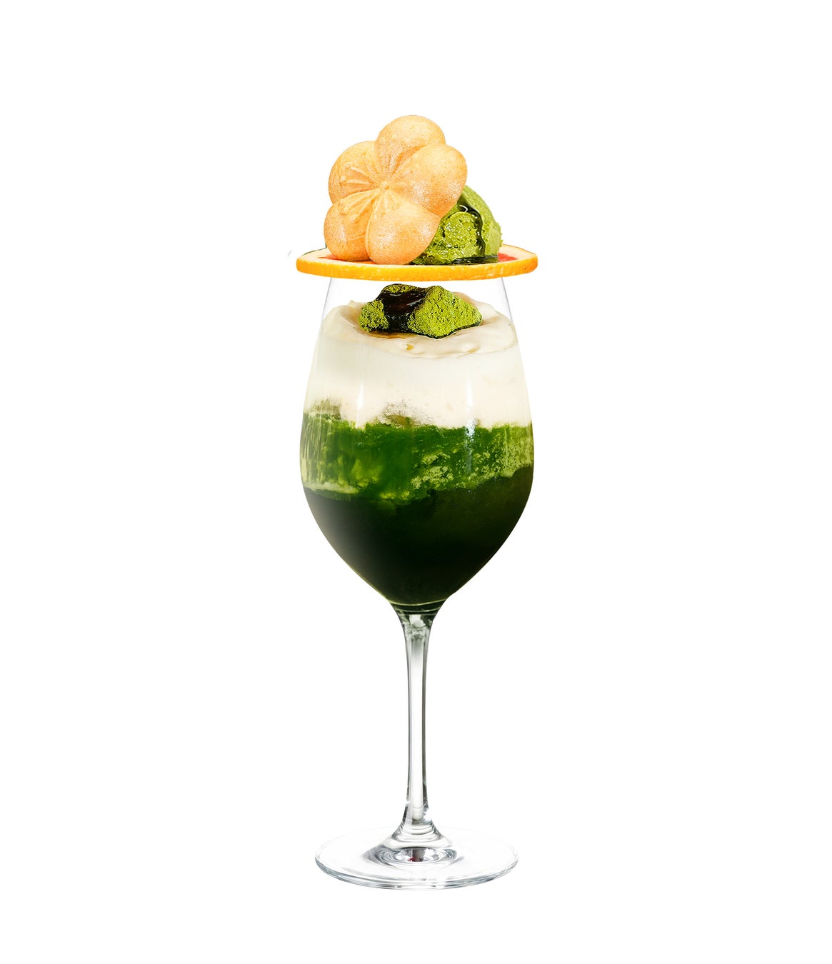 梅酒カクテルクリームソーダ MATCHA GRACEは、オリジナルの完熟梅抹茶のシロップと南高梅酒ベースにオーガニック抹茶とソーダを加え、クリーミーなヨーグルトエスプーマを重ね、梅抹茶のわらび餅を1粒乗せました。その上にスライスしたグレープフルーツで蓋をし、完熟梅抹茶のシロップをかけた抹茶アイスクリームを乗せ梅最中を添えました。濃厚な梅酒と抹茶の味わいにヨーグルトのまろやかな甘みと酸味が合わさったクリーミーで濃密な梅酒カクテルです。