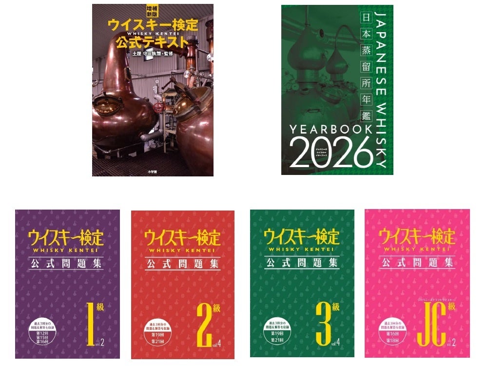 ウイスキーの定義や原料といった基本に始まり、製造工程、世界5大ウイスキーの歴史や蒸留所の紹介など、ウイスキーの基本をあますところなく説明している『増補新版 ウイスキー検定公式テキスト』は、試験対策のみならずウイスキーファン必携の一冊です。また、ジャパニーズクラフトウイスキー(JC)級の公式テキスト「ジャパニーズウイスキーイヤーブック2026」では、日本国内の蒸留所約126ヵ所を徹底紹介、その土地と蒸留所の個性、設備、発売ボトルなどのほか、ビジターセンターや見学ツアーなどの情報も満載でウイスキーツーリズムにも大活躍します。