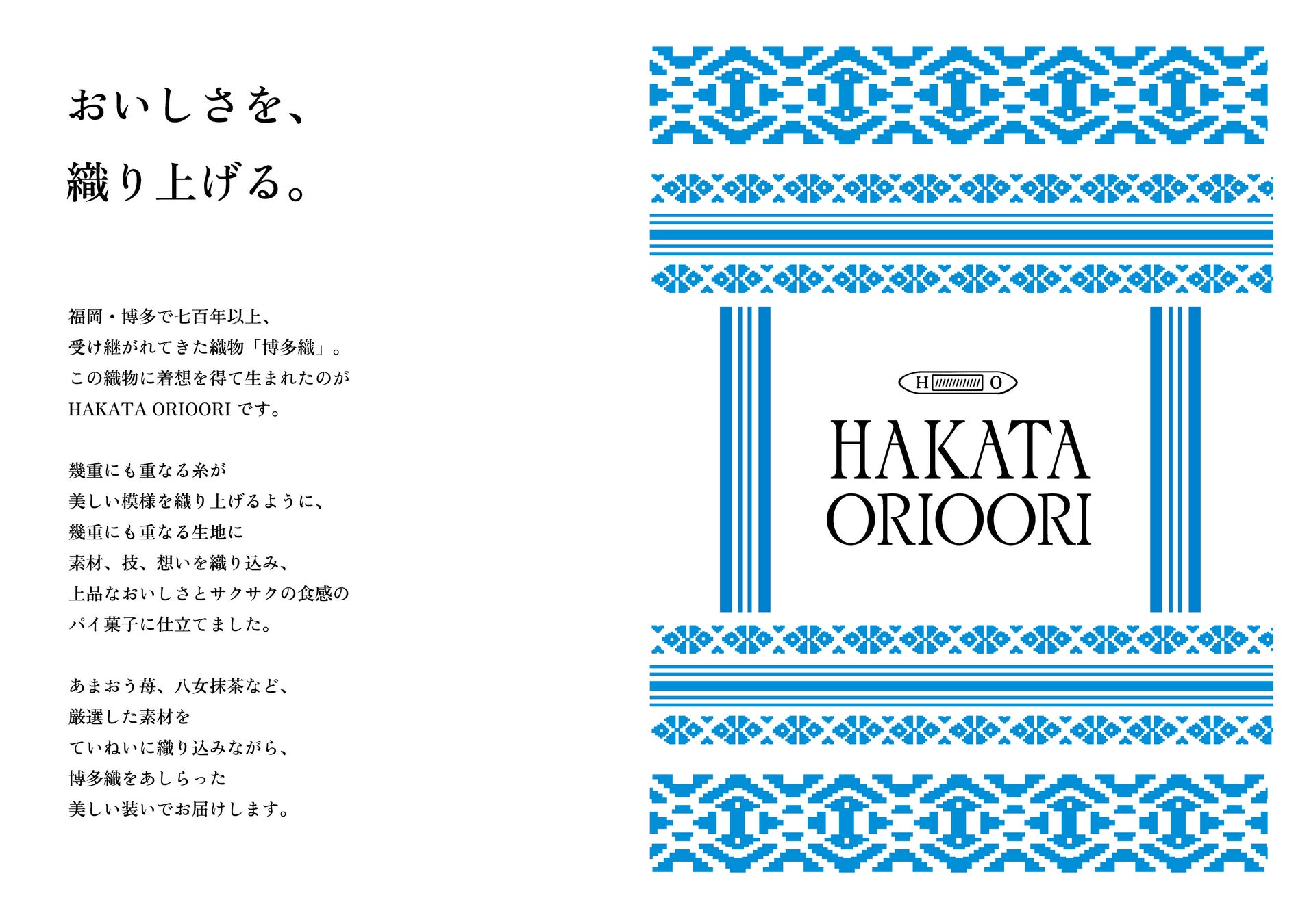 ものづくりと菓子づくりに共通する、素材、技、想いを重ねていく姿勢を「織る」と捉えています。手間と時間をかけて、作りあげる姿勢に着想を得て、【HAKATA ORIOORI(博多オリオーリ)】は誕生しました。