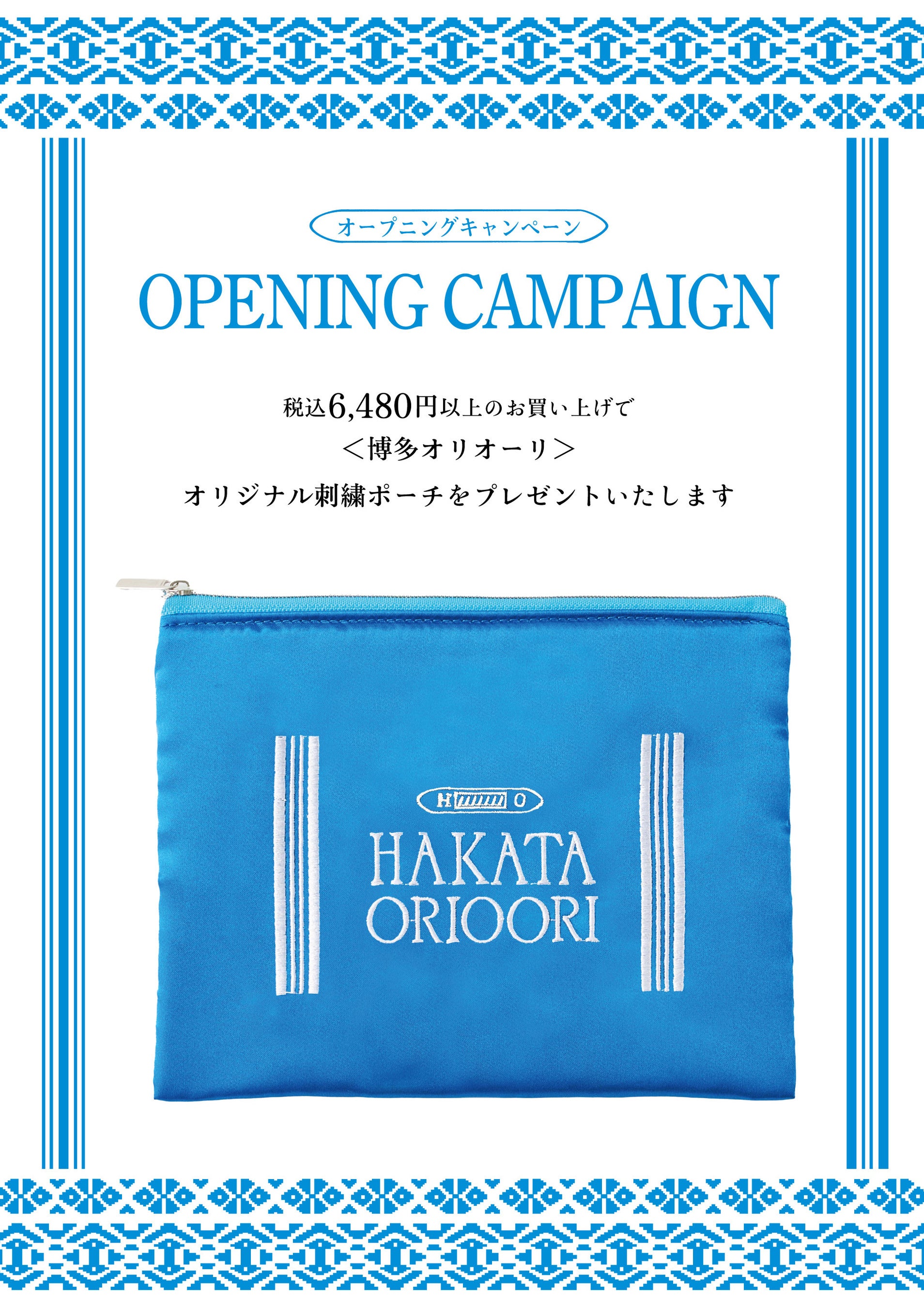 オープンを記念して、期間中、税込6,480円以上ご購入のお客様に、献上柄の親子縞をあしらったオリジナル刺繍ポーチをプレゼント!