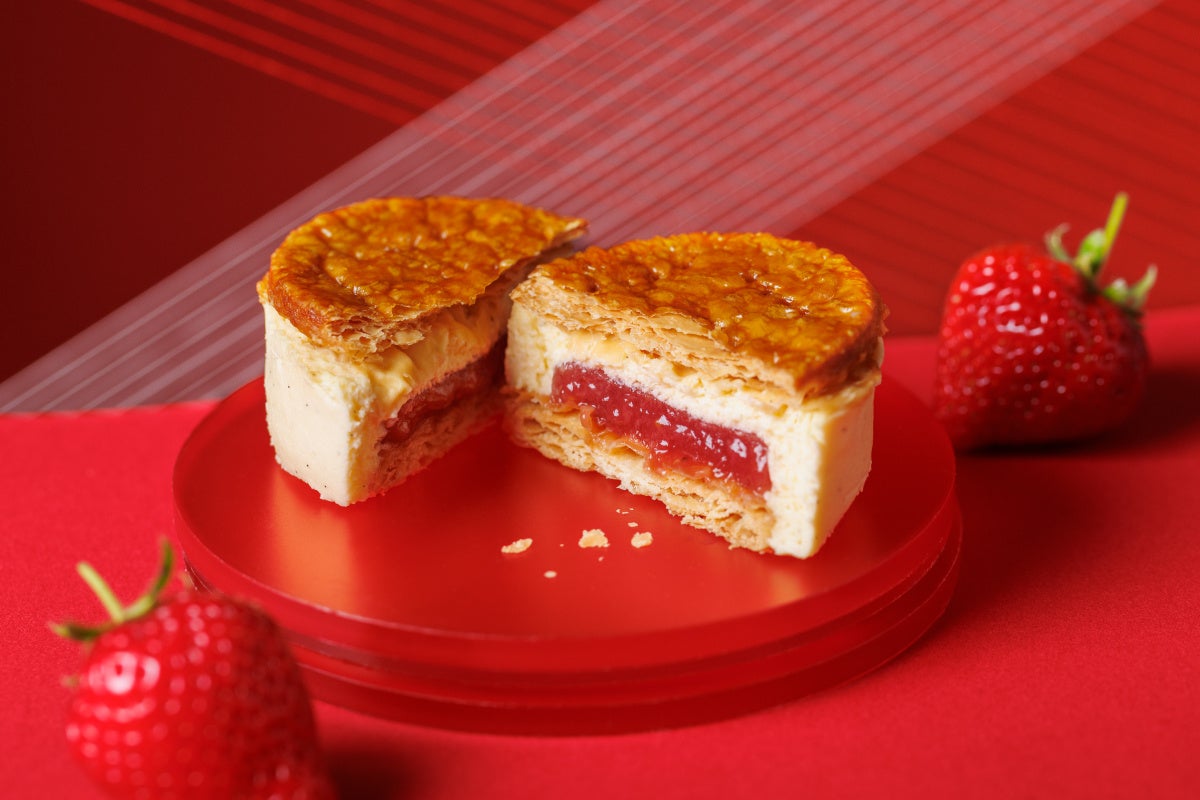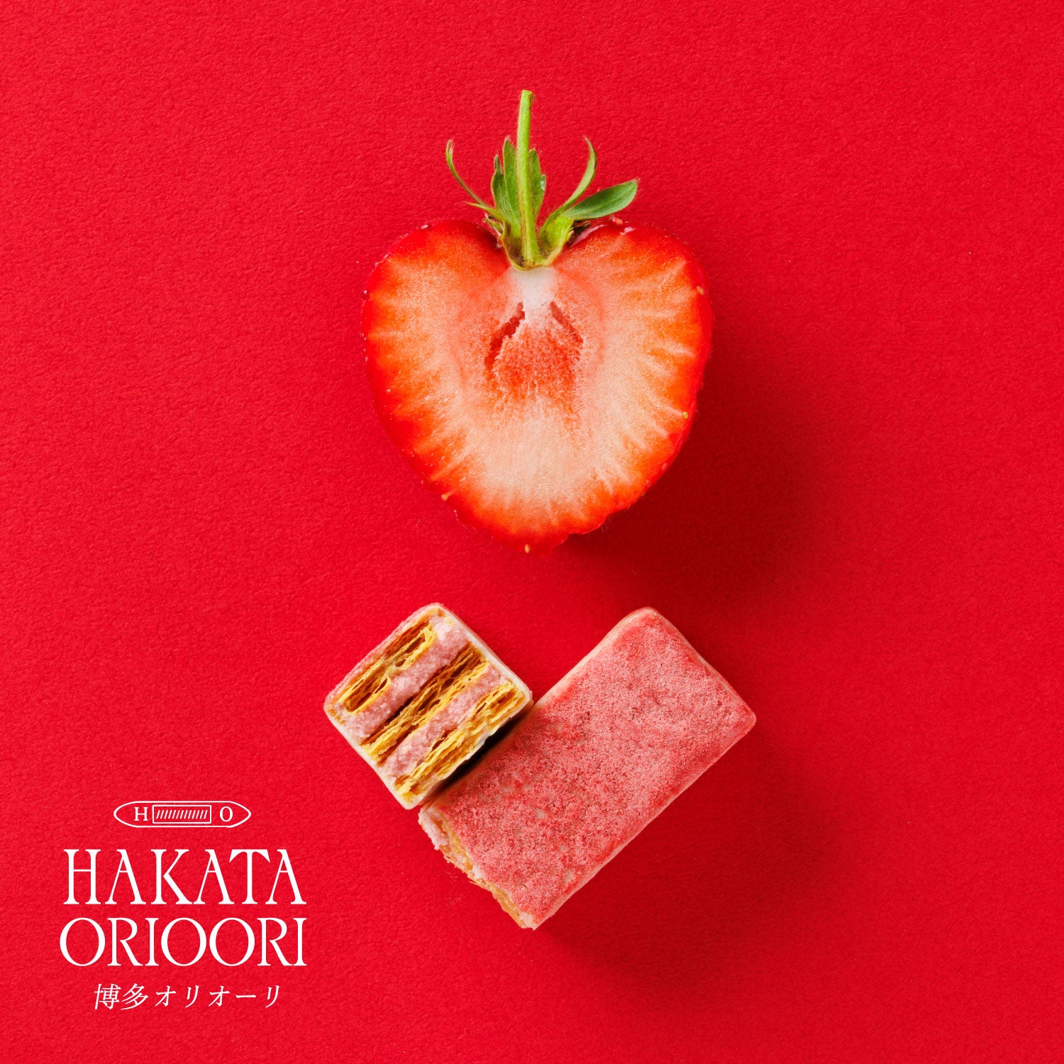 福岡県産あまおう苺で仕立てたクリームを、ニュージーランド製のパイでサンドしたミルフィユ。幾重にも織り重ねた1944層のパイは、軽やかにほどけるサクサク食感。仕上げにホワイトチョコレートを纏わせ、苺パウダーをあしらいました。博多の美意識を映した、特別なマリアージュをお楽しみください。