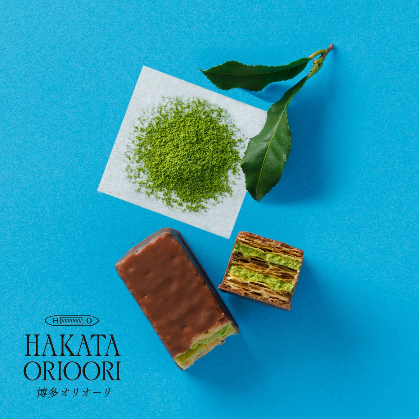 2種のミルフィユ(あまおう苺、八女抹茶)が入ったアソート。ミルフィユ(八女抹茶)は、福岡県産八女抹茶で仕立てたクリームを、ニュージーランド産パイでサンド。幾重にも折り重ねた1944層のパイは、軽やかにほどけるサクサク食感。仕上げにミルクチョコレートを纏わせました。織り重なる層とともに広がる、八女抹茶のほろ苦さとやさしい甘みが調和する、奥行きのある味わいに仕上げました。