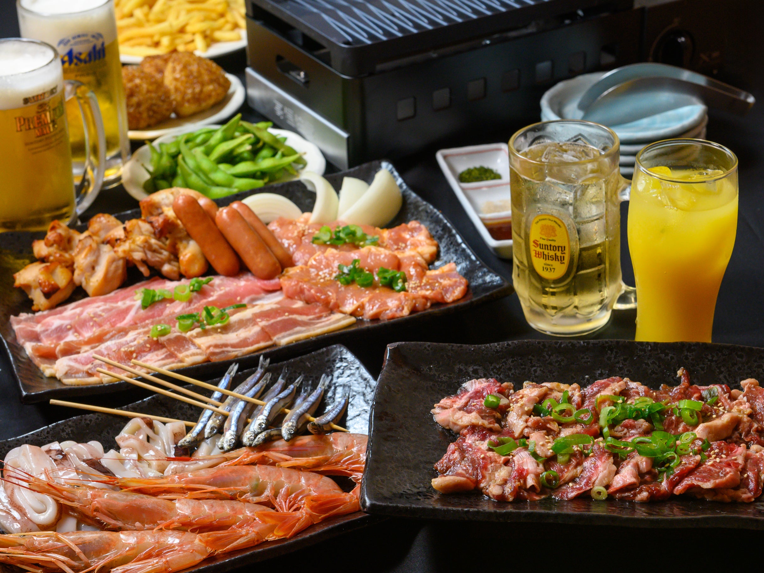 厳選黒毛和牛カルビ/海鮮盛合わせ(海老・イカ・きびなご)/牛ヒレ/味付け豚ロース/豚バラ/鶏せせり/ウインナー/フライドポテト/枝豆(食べ放題)/季節の〆