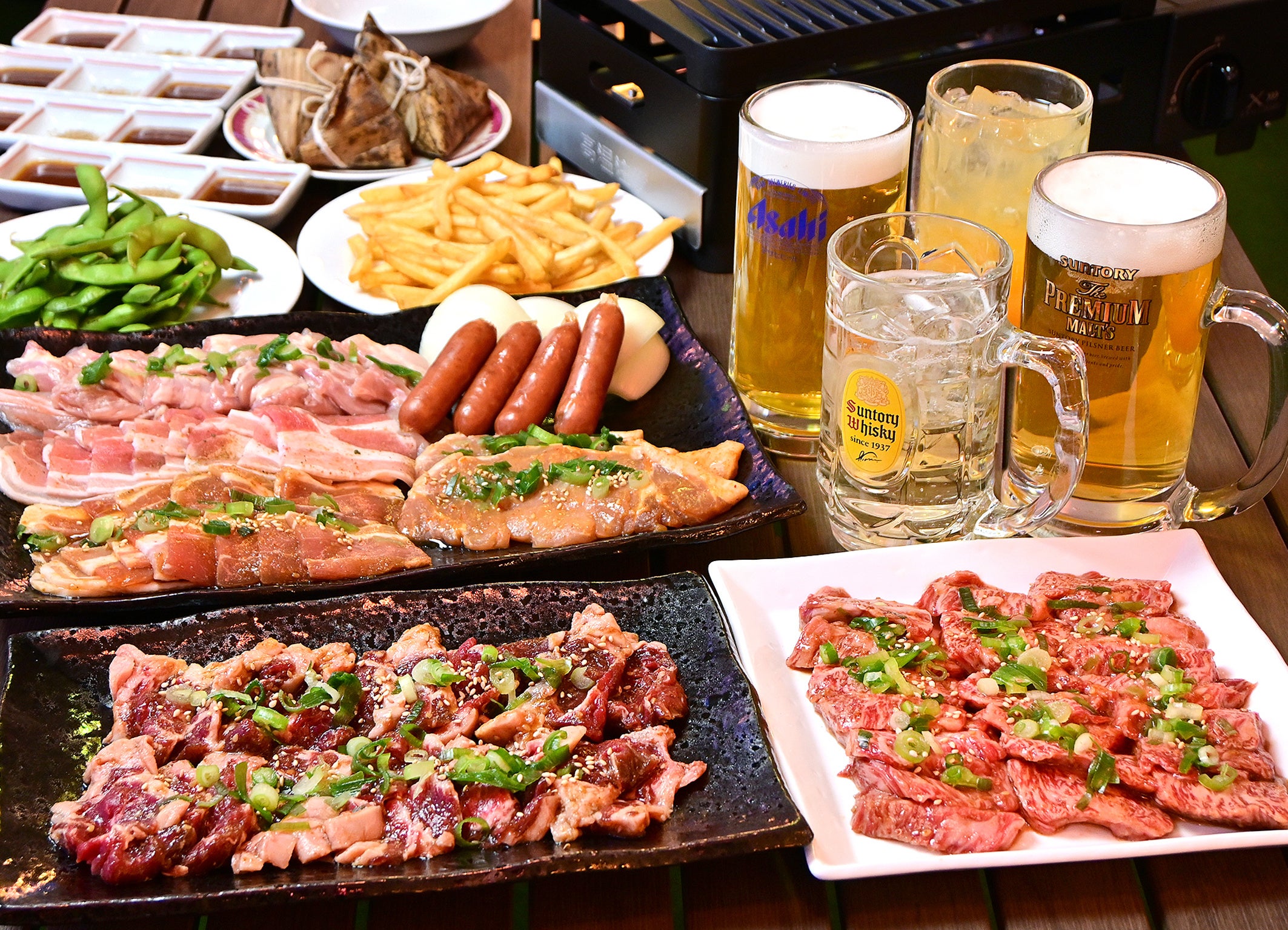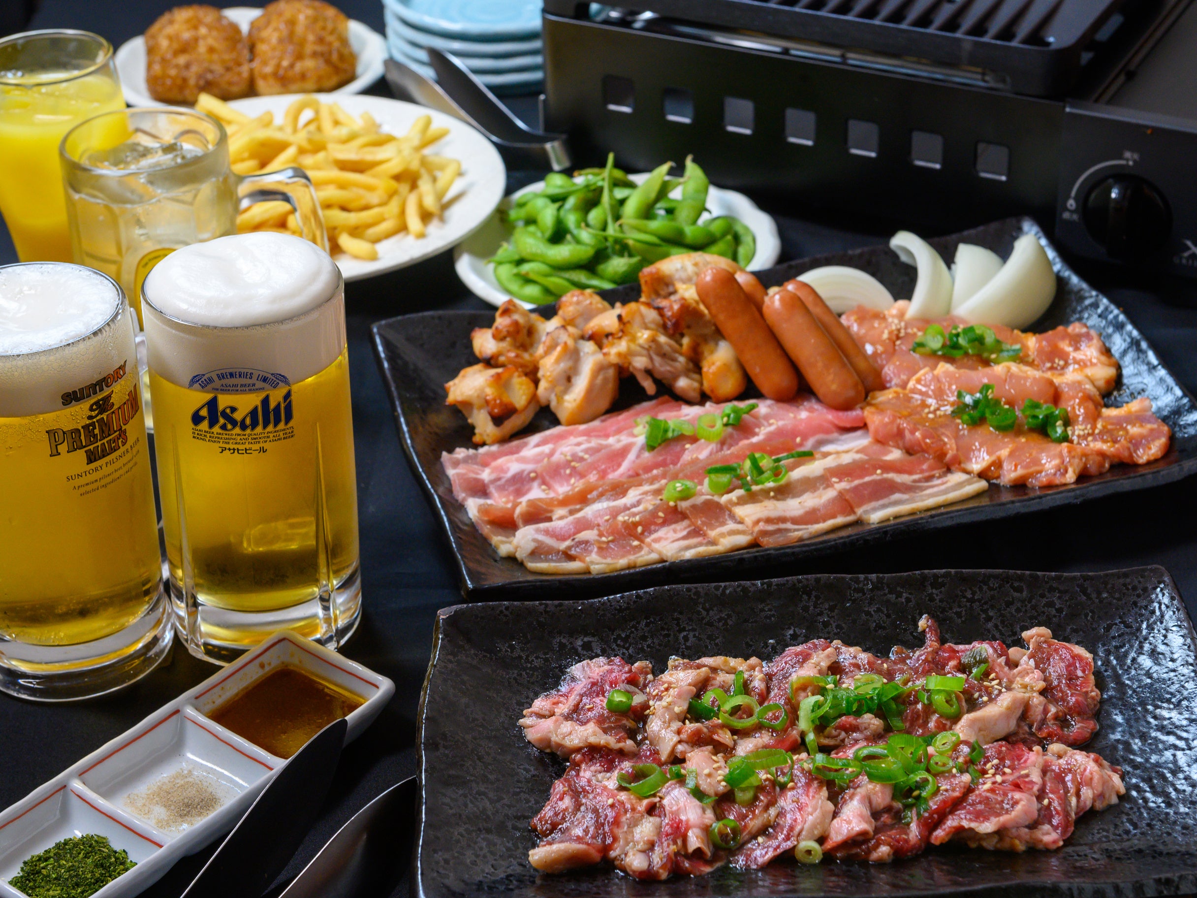 厳選黒毛和牛カルビ/牛ヒレ/味付け豚ロース/豚バラ/鶏せせり/ウインナー/フライドポテト/枝豆(食べ放題)/季節の〆