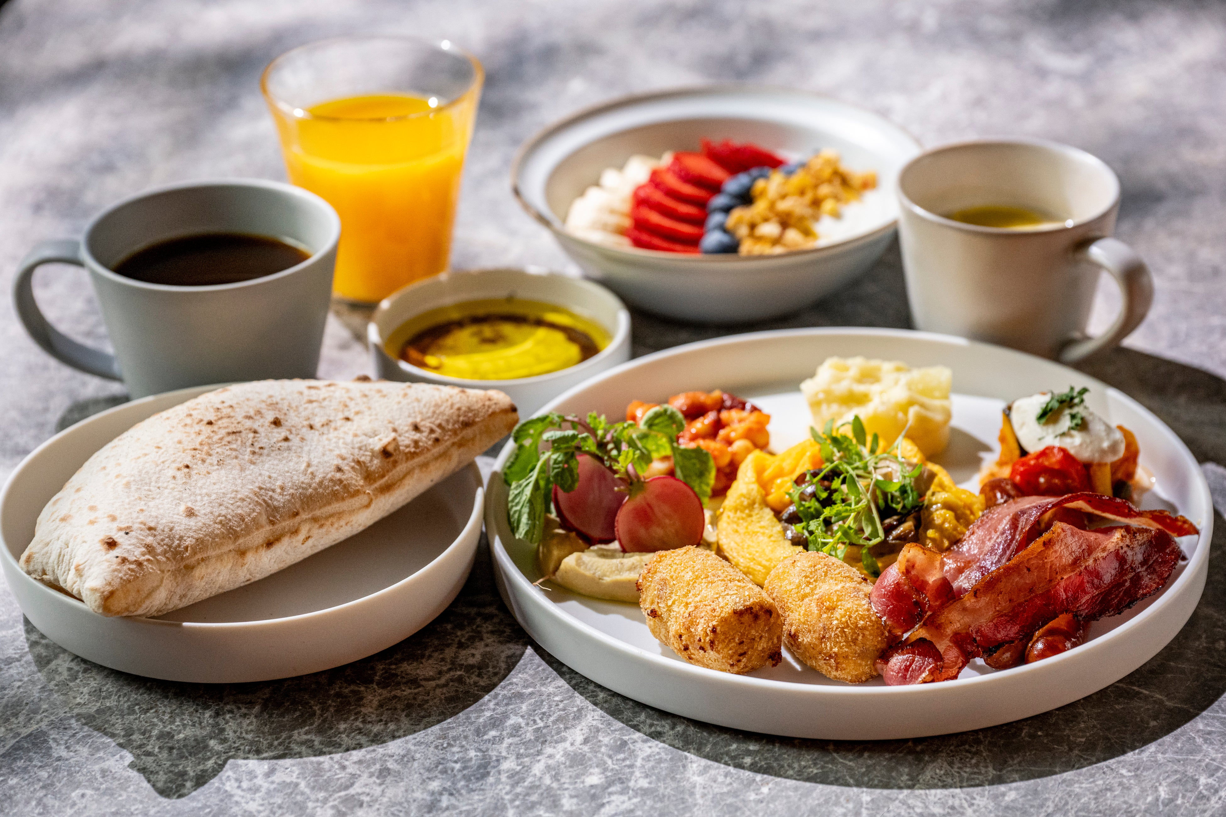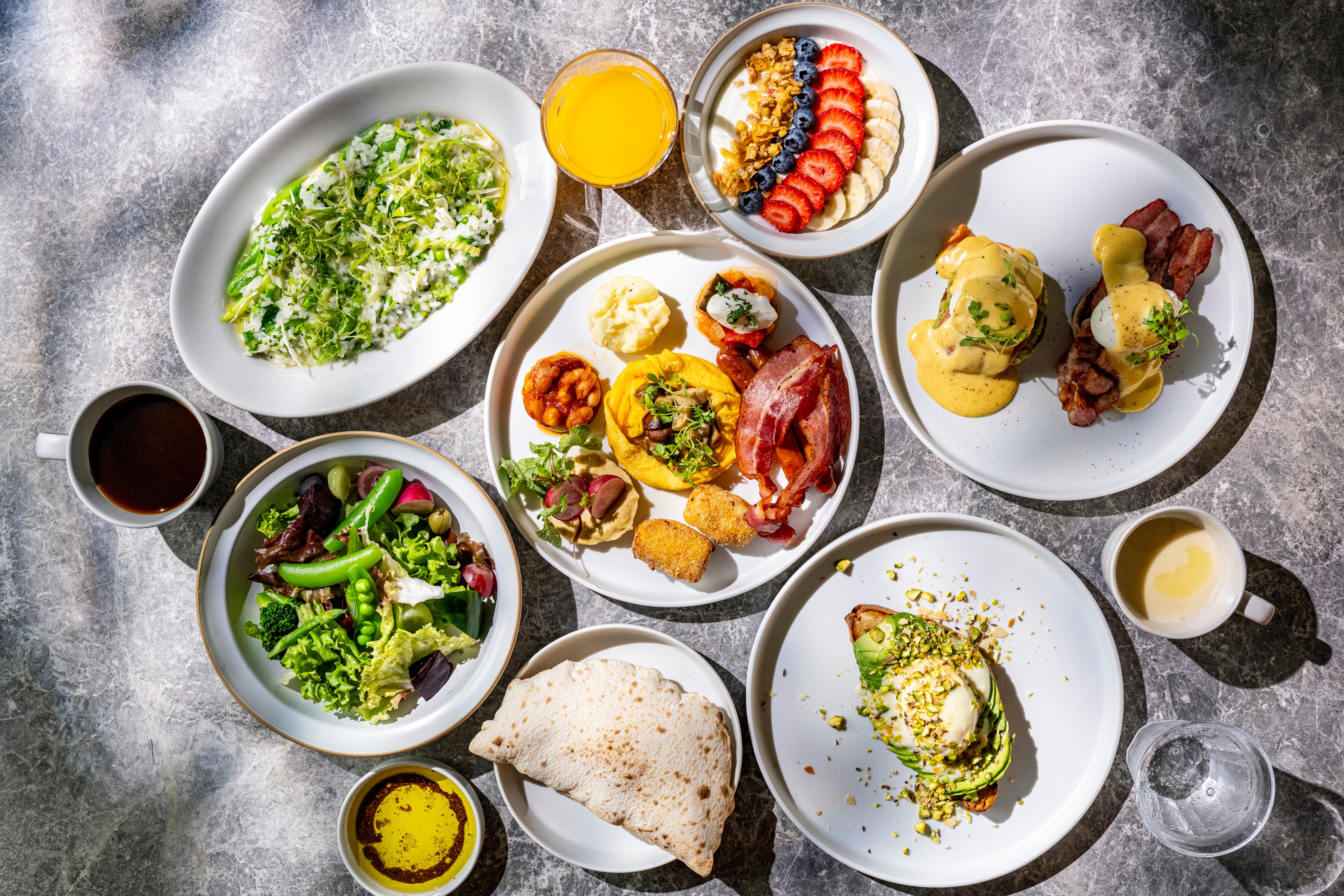 朝食では、九州の生産者から届く旬の食材を中心に、土地の恵みをそのまま味わう“Farm to Table”の思想を最も感じられるメニューをご用意しています。ビュッフェには、熊本県阿蘇郡産山村「UBUYAMA PLACE」のストラッチャテッラをはじめ、 九州各地の食材を使用したサラダやヨーグルトなどを提供します。選べるメインディッシュ4種の内のひとつ「MORETHAN BREAKFAST」では、 イタリア製の窯で毎朝焼き上げるピッツァパーネ(ピッツァ生地で焼き上げるパン)を添え、 焼き立ての香りとともに朝を迎えられる内容としています。