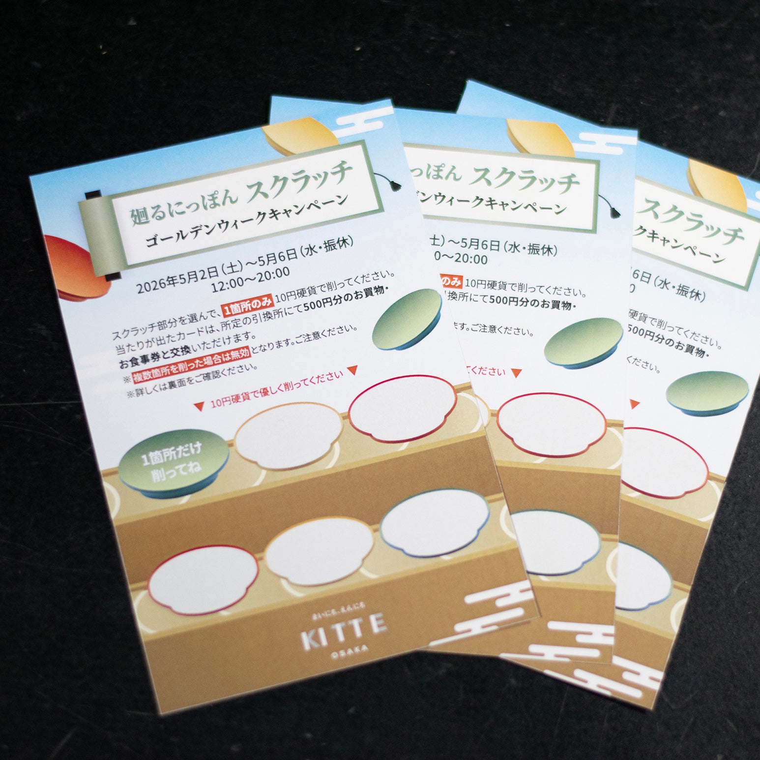 館内でのお買い物に応じて参加できるスクラッチキャンペーンを実施。期間中、各日5,000枚、合計で最大25,000枚のスクラッチカードを配布、当たれば500円分のお買物・お食事券をプレゼント!新たな“ええもん”との出会いを、おトクにお楽しみください。