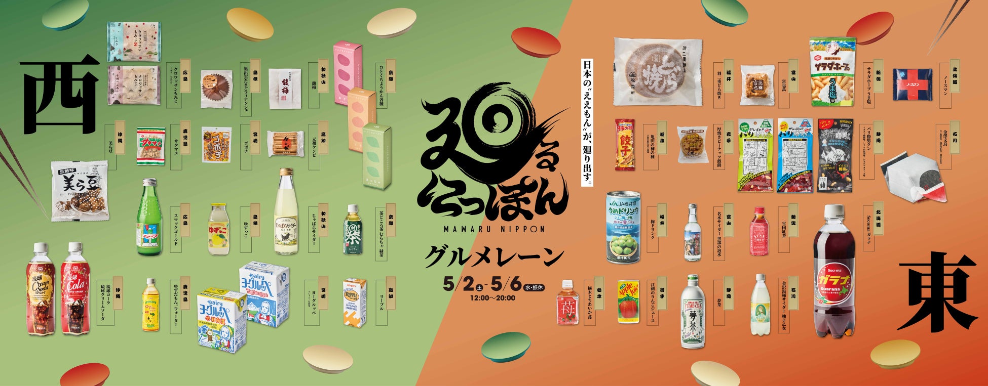 回転寿司を模したレーンに、日本各地の食品(お菓子・ドリンク)が流れる体験型イベントです。来場者は東日本・西日本に分かれたレーンから商品を選び、味わう体験を楽しめます。回転寿司という親しみやすく直感的な体験を通して、「知らなかった日本のええもん」との胸弾む出会いを提供します。