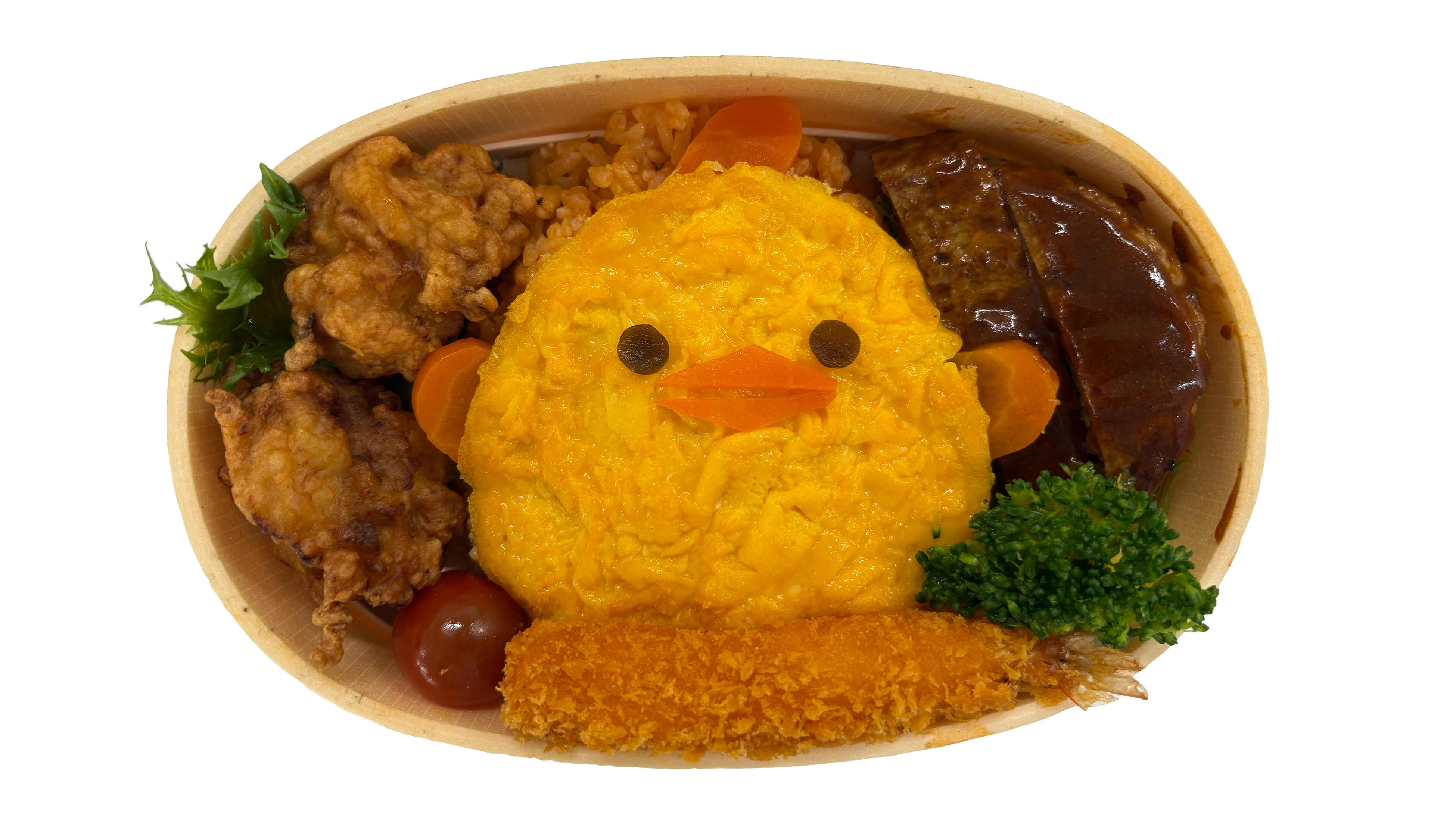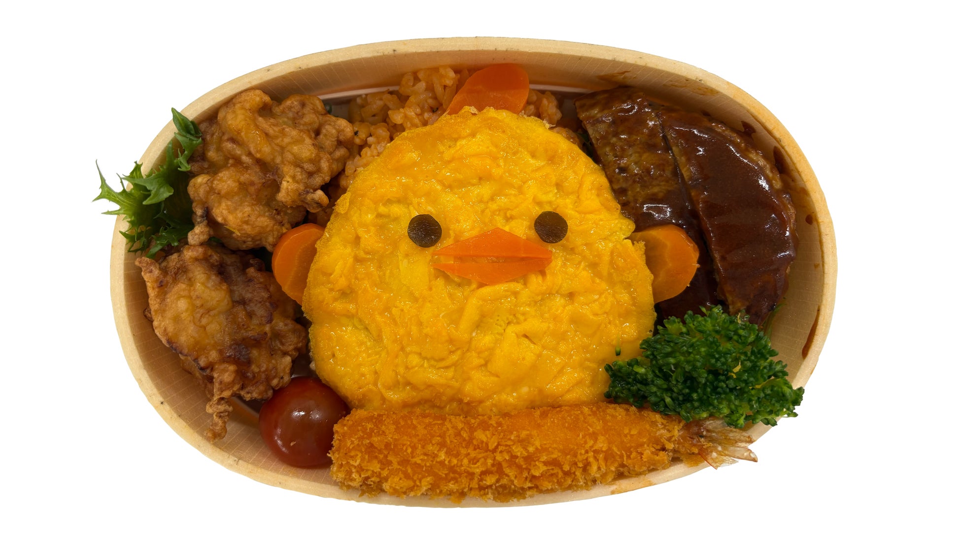 仕出し料理店が手がける和風仕立ての「ぴよりんオムライス」に、からあげ、ハンバーグ、エビフライなど、お子さまにも喜ばれるおかずを詰め合わせたお弁当です。