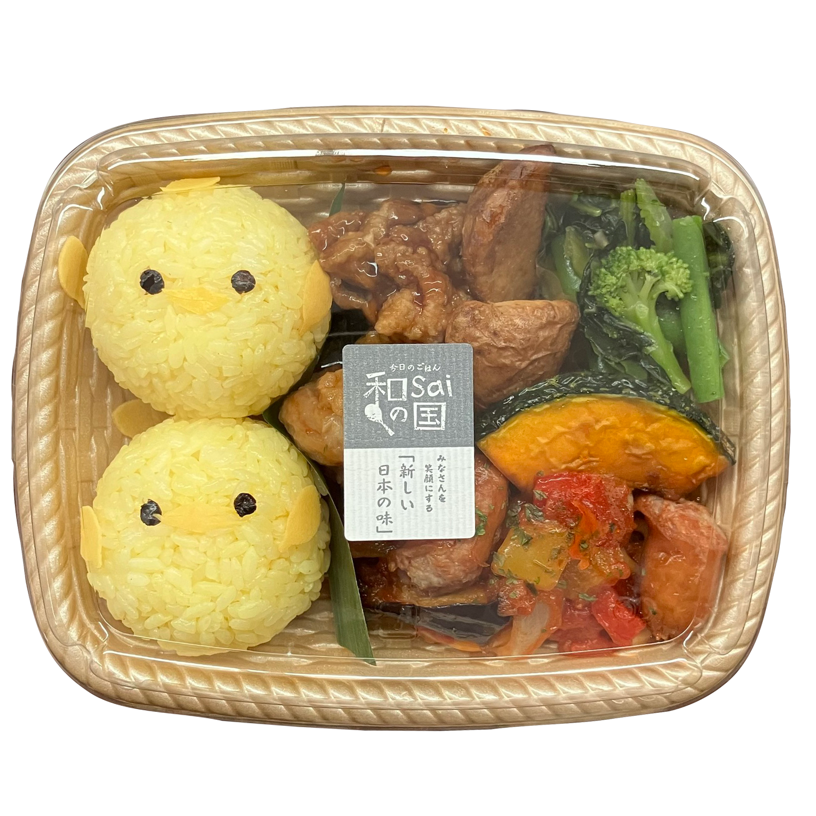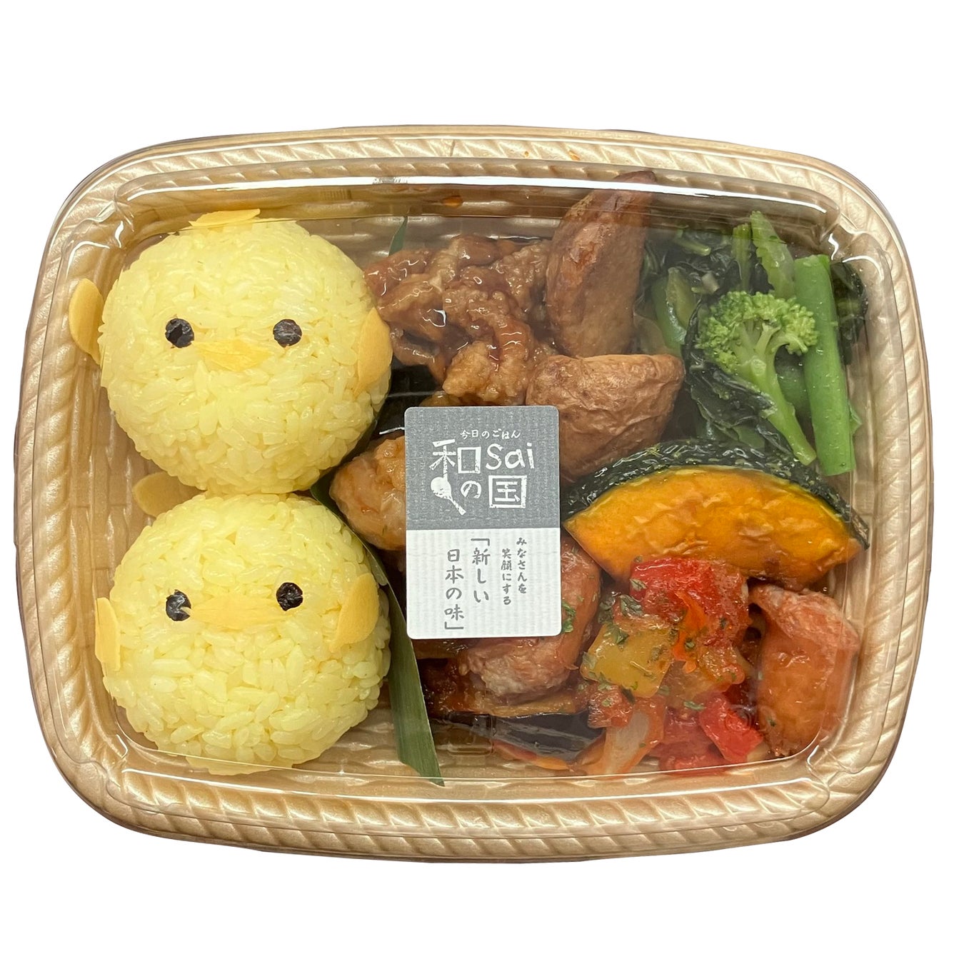 サフランの香りにガーリックやオニオンの風味を加えた洋風ごはんで仕立てた「ぴよりんおにぎり」に、彩り豊かな野菜の和惣菜を組み合わせた、女性にうれしい和洋折衷弁当です。