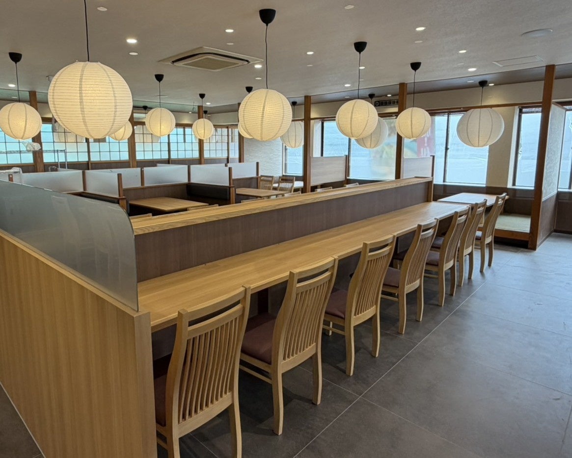 このたびの改装では、平日のお昼を中心に多くご来店されるお一人様にも気軽にご利用いただけるよう、カウンター席を増席しています。また、過去の改装時にお客様からご要望の多かった小上がり席を多めに残したのも、今回が初めての試みです。お一人でのお食事からご家族連れでのご利用まで、さまざまなニーズに応えられる席配置としました。店内は、カウンター19席、テーブル席5卓20席、小上がり席11卓60席の計99席を備えています。