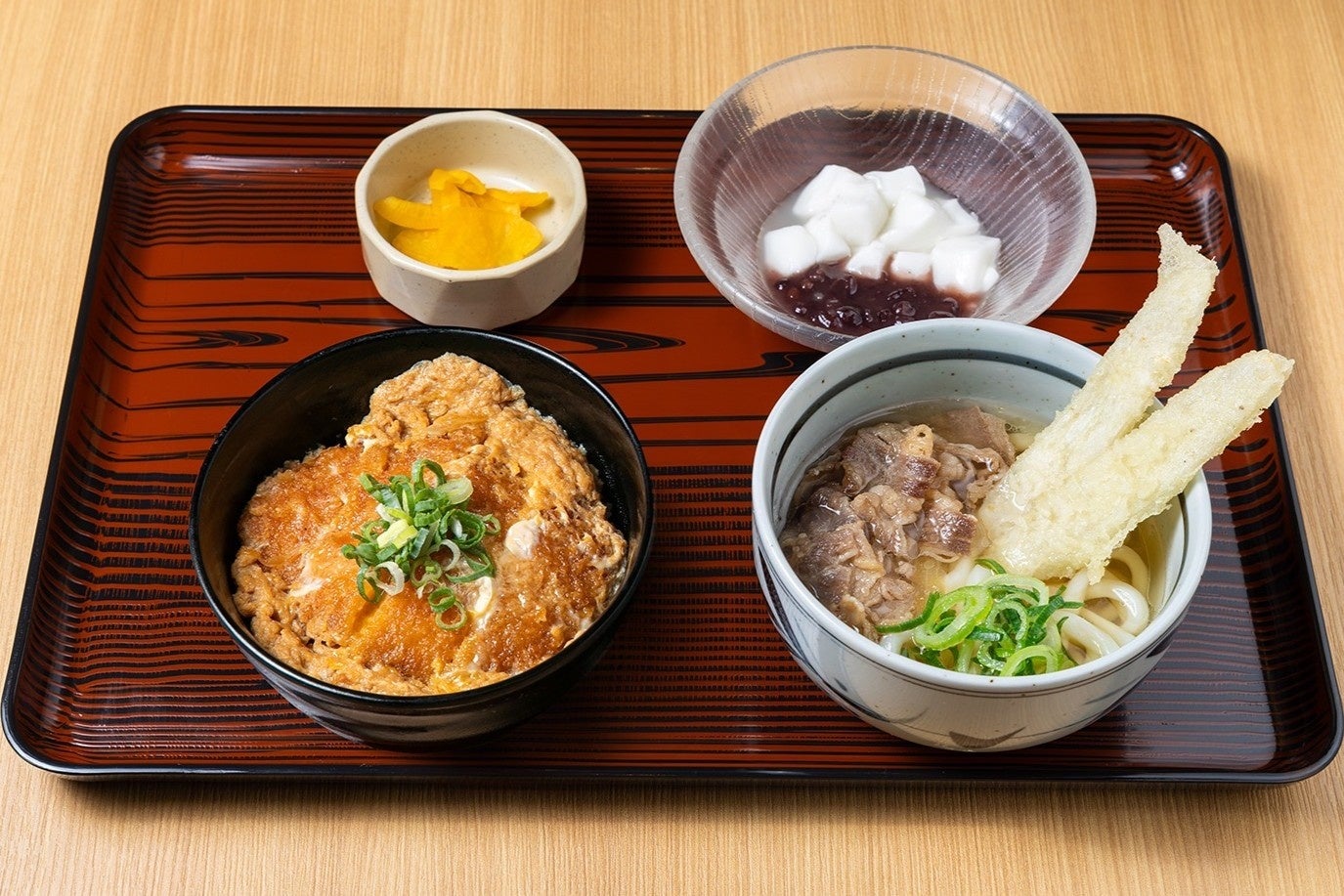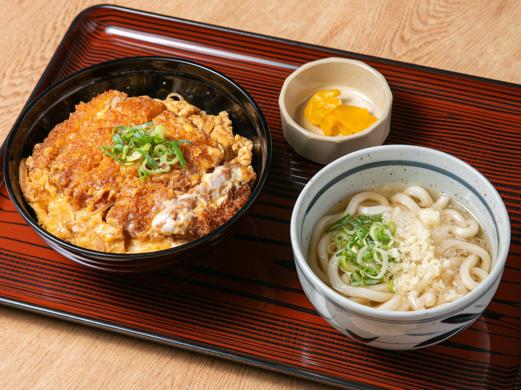 筑紫野店では、うちだ屋らしい人気のセットメニューに加え、各種ランチメニューもご用意します。おすすめは、新しく生まれ変わった「新ミニミニセット」です。人気の選べるミニ丼(かつ丼・天丼・ねぎとろ丼)に、ミニ肉ごぼう天うどん、さらに豆乳を使ったヘルシーな杏仁豆腐につぶあんソースを添えたデザートまで付いた、満足感のあるセットです。