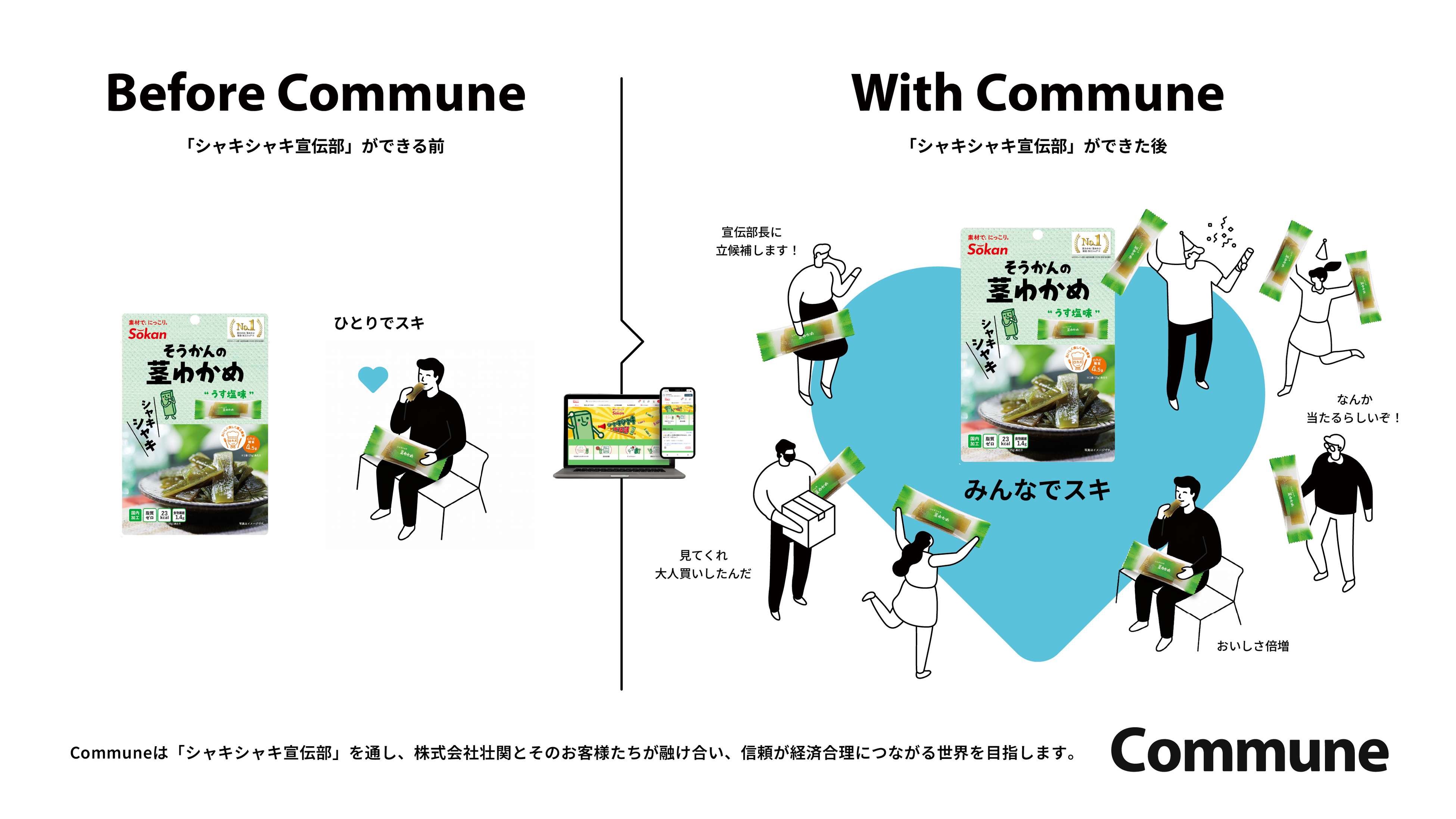 相互交流で信頼を育む「Commune(コミューン)」を提供するコミューン株式会社は、茎わかめ・茎めかぶなどを製造・販売する株式会社壮関が、茎わかめなど素材菓子が好きな人同士が集まり、良さを語り合い、楽しく広めるオンラインコミュニティ「シャキシャキ宣伝部」を、2026年4月20日(月)よりオープンすることをお知らせします。