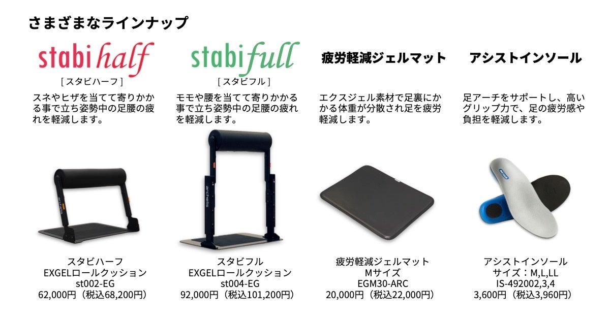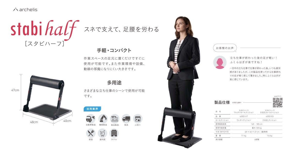 アルケリス株式会社(神奈川県横浜市、代表取締役 佐保 勝彦・藤澤秀之)は、2026年4月22日(水)にホテルニューオータニにて開催される「関東ホテル・旅館業界IT&リノベーション展示商談会(第一回)」に、立ち仕事を支えるサポートデバイス「スタビハーフ」をはじめとするスタビシリーズおよび疲労軽減ジェルマット、アシストインソールを出展いたします。本展示会では、ホテル・旅館業界が直面する人手不足・スタッフの身体的負荷・高齢化といった課題に対し、「働く人の足腰負担を軽減し、美しい立ち姿勢を支える」当社製品の活用イメージを、実機体験を通じてご紹介します。