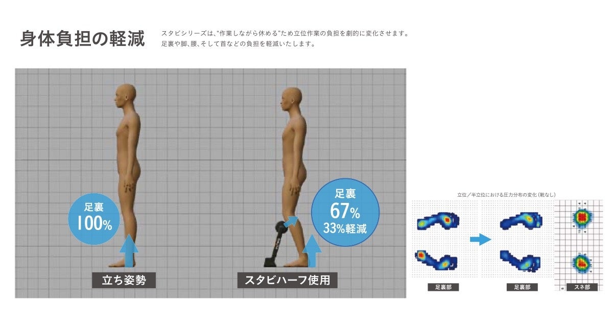 フロント、クローク、レストラン受付、キッチンなど、ホテルの実際の業務シーンを想定した姿勢で「スタビハーフ」を体験いただけます。スネ・ヒザで身体を支えることで、足裏への荷重を最大33%軽減します。