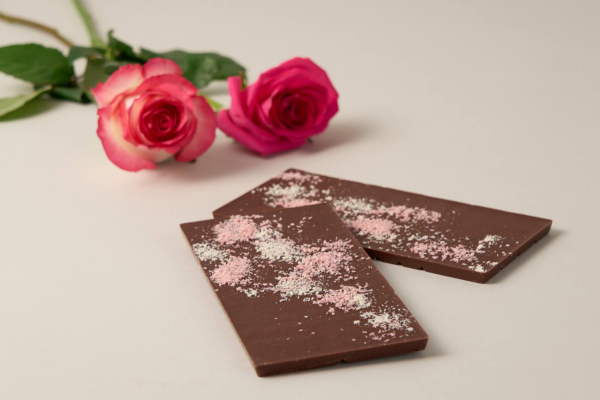 土台となるのは、赤いベリーのような爽やかな酸味が特徴のマダガスカル産カカオ。ローズオイルの優雅な香りを引き立てるため「細挽き」製法を採用しました。酸味の角を落とし、砂糖の種類まで吟味することで、カカオの果実感とバラの香りが完璧なハーモニーを奏でる仕立てにこだわりました。