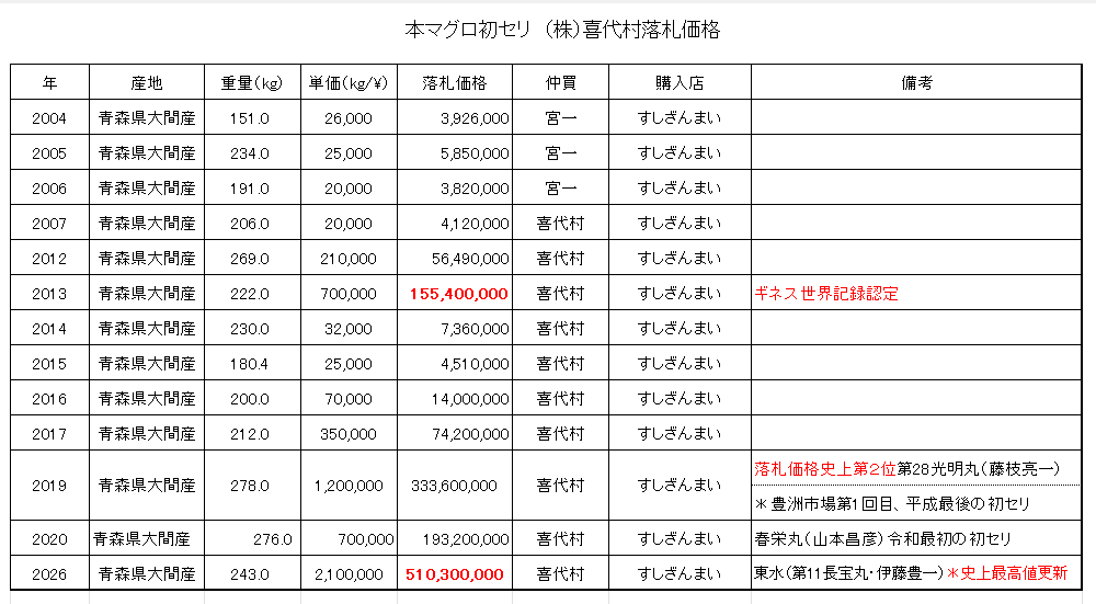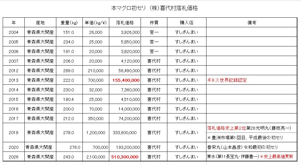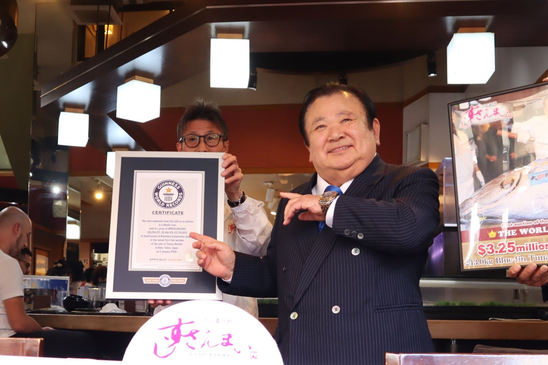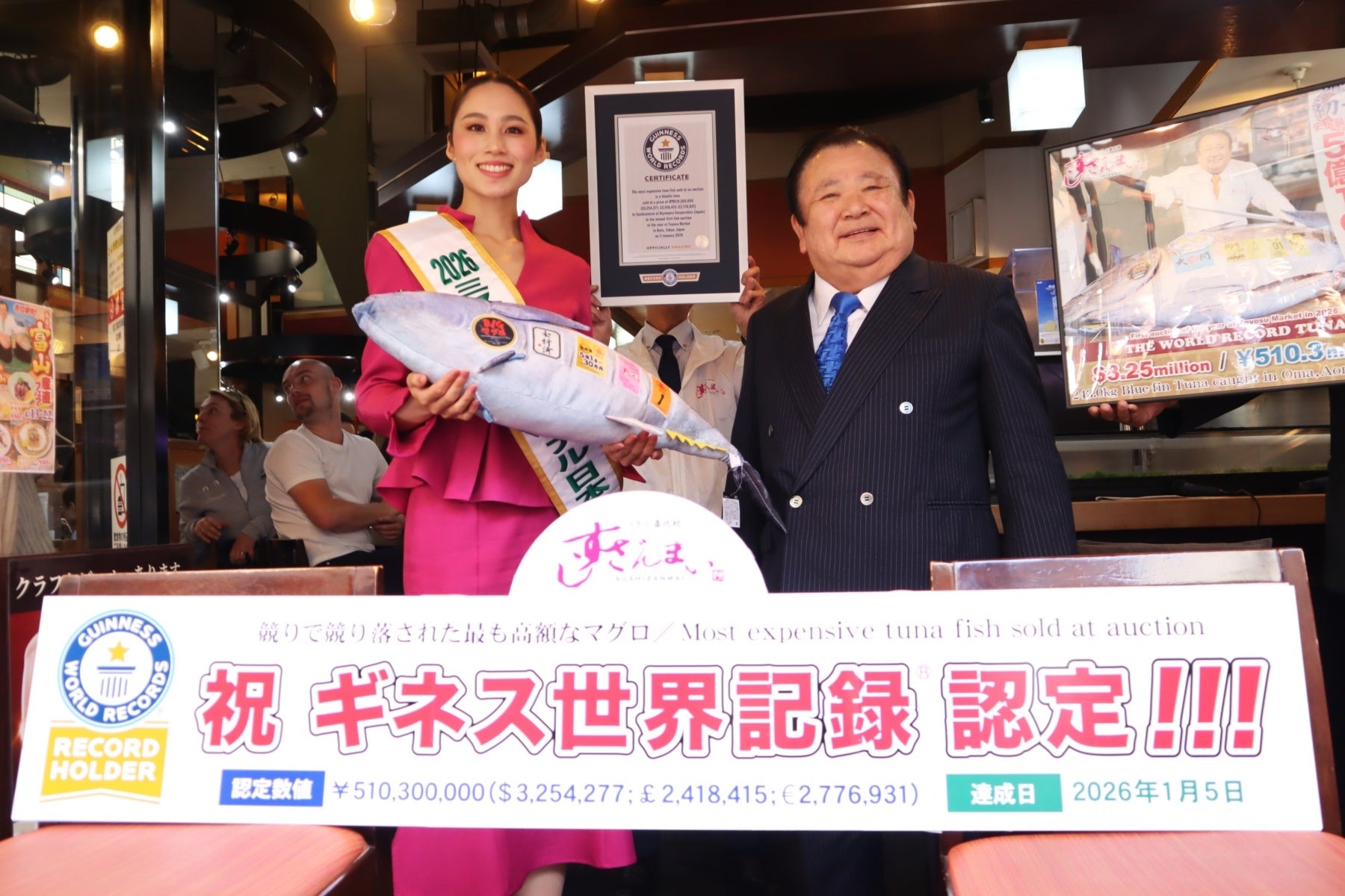 寿司チェーン店「つきじ喜代村すしざんまい」を運営する株式会社喜代村(本社:東京都中央区)が、2026年1月5日の豊洲市場にて5億1030万円で落札した青森県大間産243kgの本マグロが、この度、「競りで競り落とされた最も高価なマグロ(The most expensive tuna fish sold at an auction)」としてギネス世界記録として認定されました。