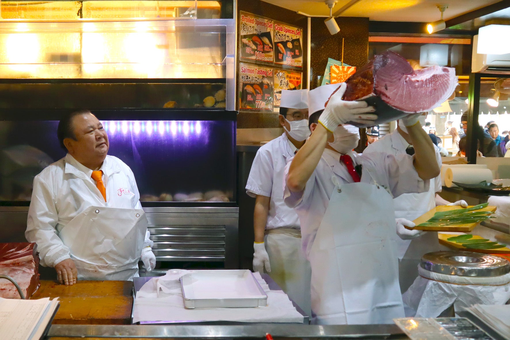 「今日はお集まりいただきありがとうございます。皆様のおかげで今年も良いマグロを買うことができました。一番良いマグロを買ったらギネス世界記録™に認定されました。来年も再来年も、一番良い美味しいマグロを買って提供しますのでよろしくお願いいたします。」