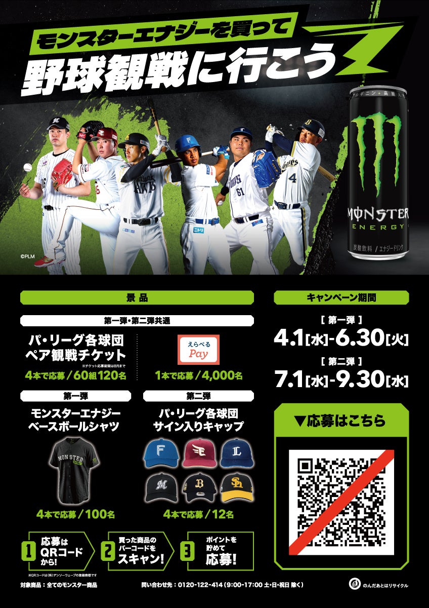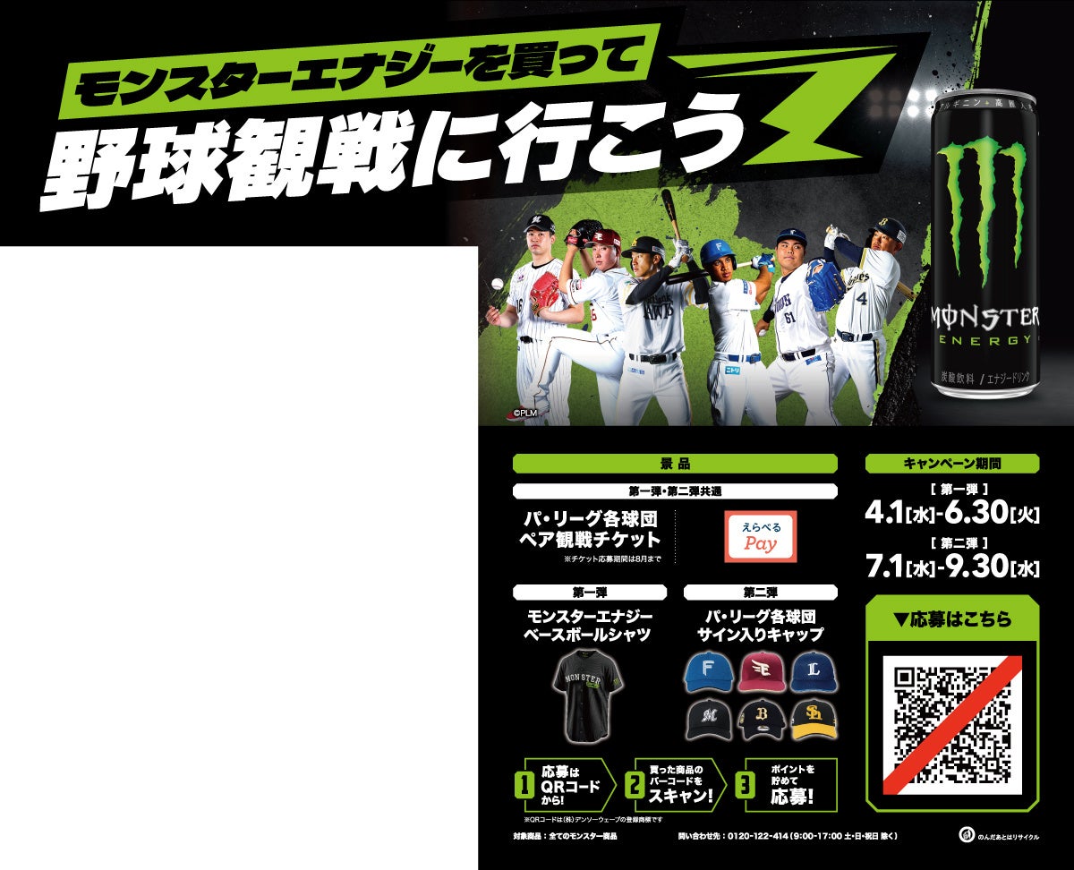 国内No.1エナジードリンク(※)であるモンスターエナジーは、パシフィック・リーグ6球団(北海道日本ハムファイターズ、東北楽天ゴールデンイーグルス、埼玉西武ライオンズ、千葉ロッテマリーンズ、オリックス・バファローズ、福岡ソフトバンクホークス)の共同プロモーション企画を統括するパシフィックリーグマーケティング株式会社(本社:東京都港区、代表取締役 CEO:成田 健太郎)と、9月30日(水)までの期間中、総勢4,232名に賞品があたる自販機限定企画「モンスターエナジーを買って野球観戦に行こう」キャンペーンを開催いたします。本キャンペーンは、キャンペーン告知が設置されている対象の自販機で購入したモンスターエナジー商品でご参加いただけます。