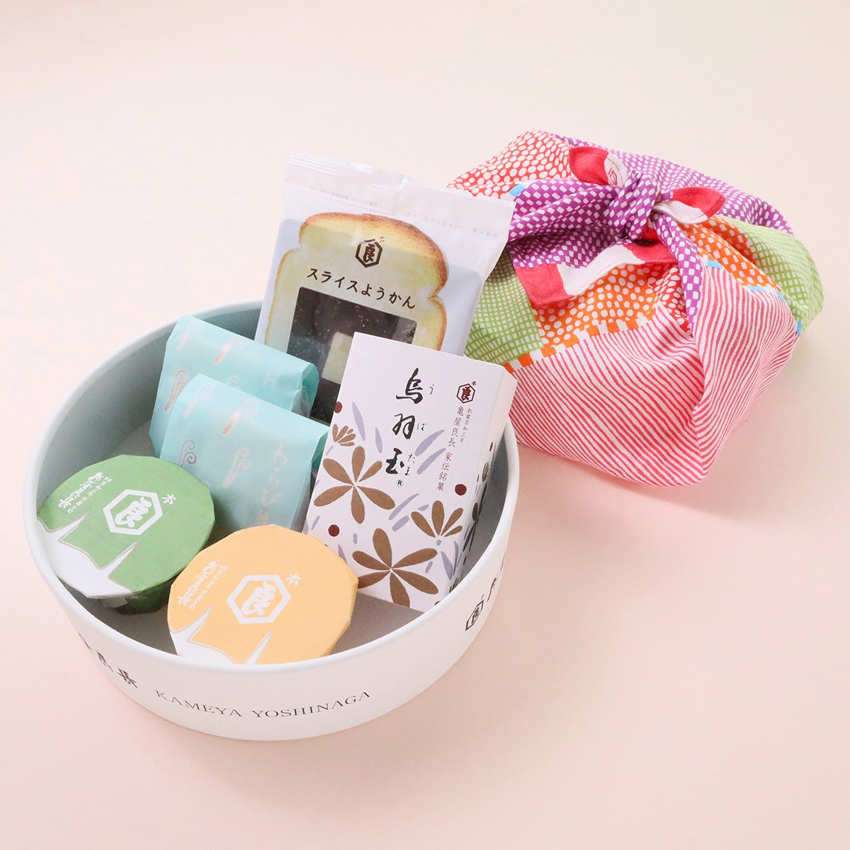 京都のテキスタイルブランド「SOU・SOU」の、上質な風呂敷でお包みしてお届けいたします。お菓子を食べ終わった後も風呂敷をお使いいただける、とっておきのギフトです。