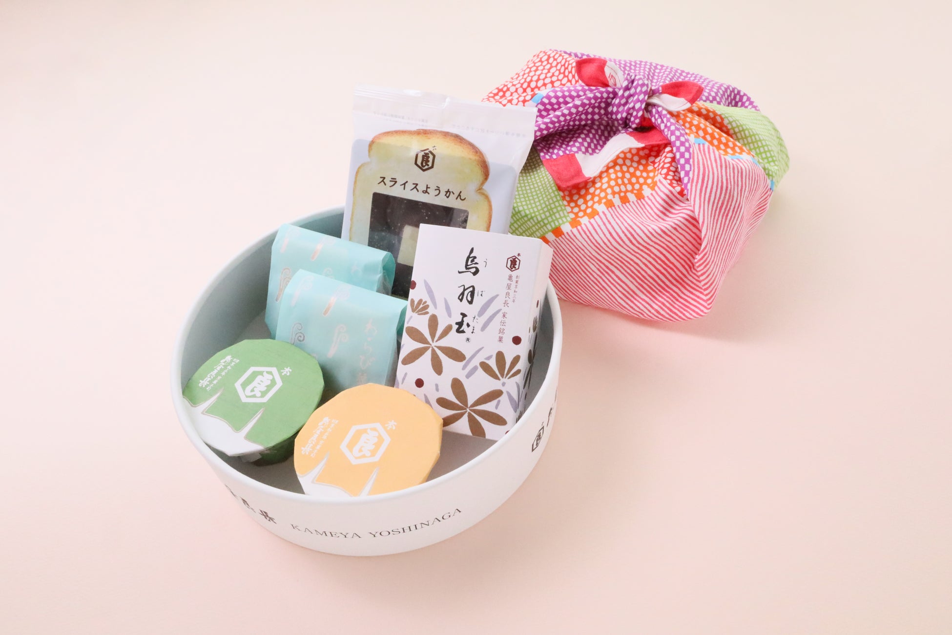 他にも、こんなギフトをご用意しております。代表銘菓「烏羽玉」「スライスようかん〈小倉バター〉」に、ひんやり美味しい「和ぷりん(和三盆・お濃茶)」と「わらび羹」をお詰めしたセットです。お日保ちの長いお菓子を中心にセレクトしておりますので、ゆっくりお楽しみいただけます。