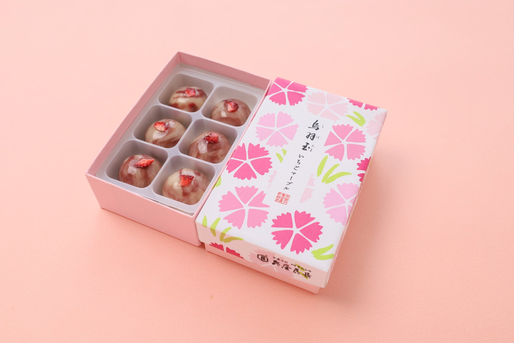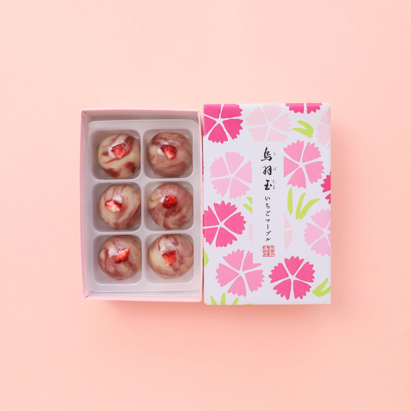 代表銘菓の「烏羽玉」に、母の日限定「いちごマーブル」ができました。白餡にいちごと練乳を合わせた餡玉に、乾燥いちごをトッピングし、寒天をかけて艶やかに仕上げました。小さなひと粒にぎゅっと凝縮されたいちごの甘酸っぱさと、練乳のミルキーな風味が調和したお味です。