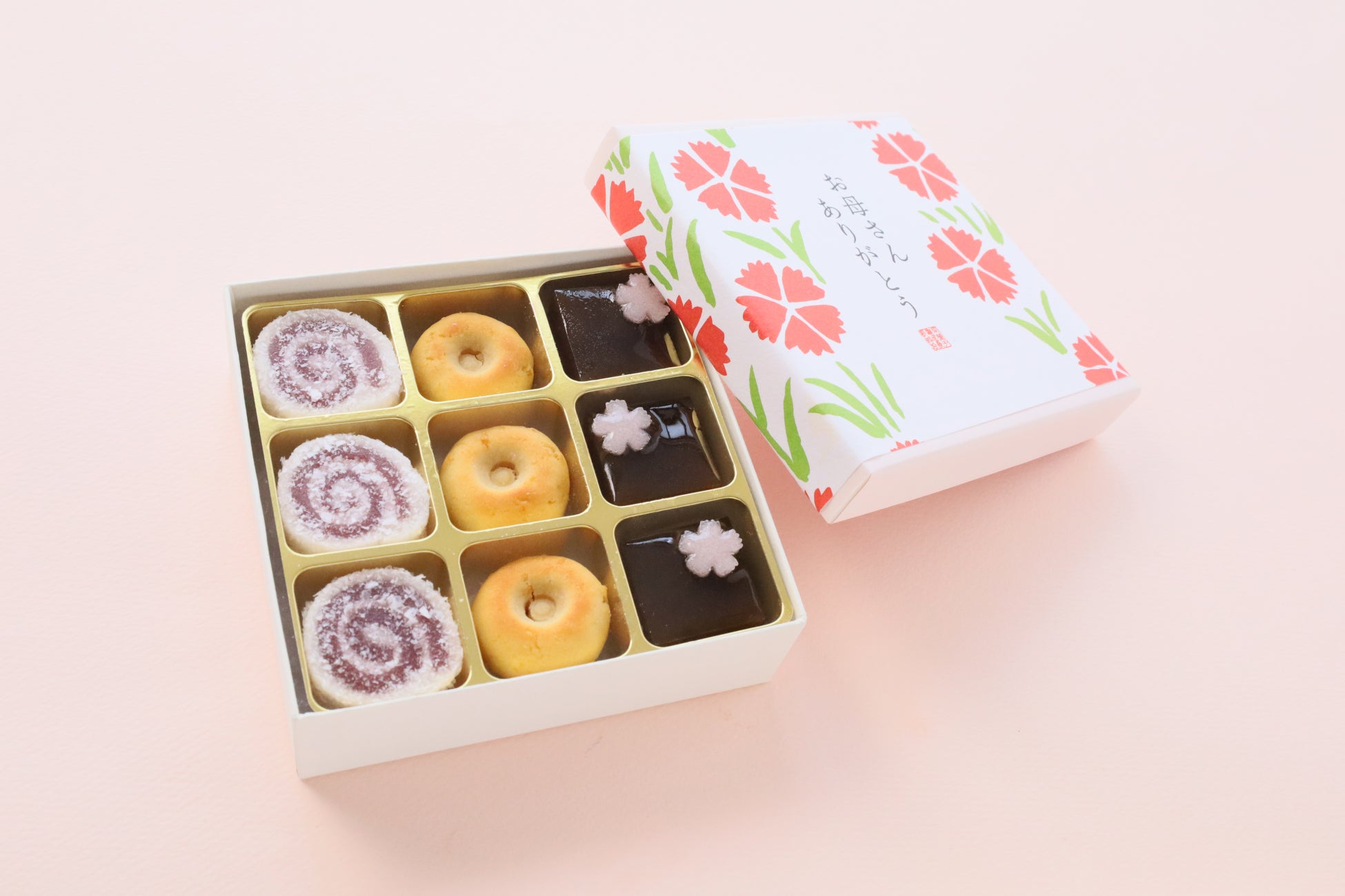 伝統的な桃山の生地に、甘夏・レモン・クリームチーズを合わせて焼き上げた「満々」、甘酸っぱいいちご羊羹を柔らかな求肥で巻いた「醒ヶ井(さめがい)」、カーネーション型の羊羹をあしらった「小倉羊羹」を食べやすいひと口サイズに仕立て、小箱に詰合せました。