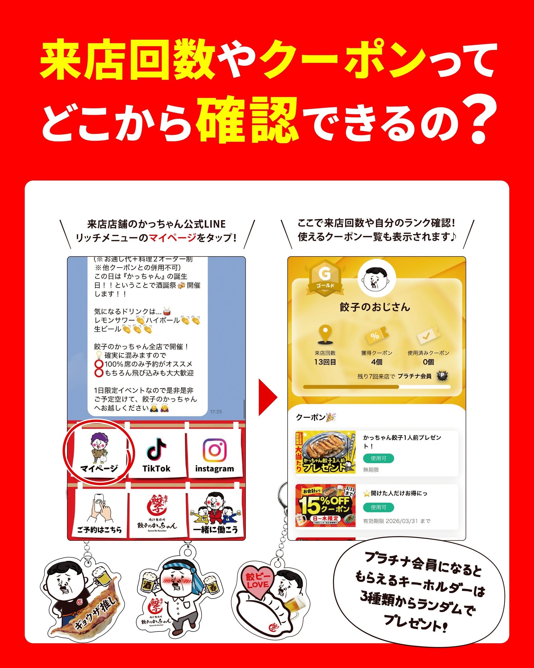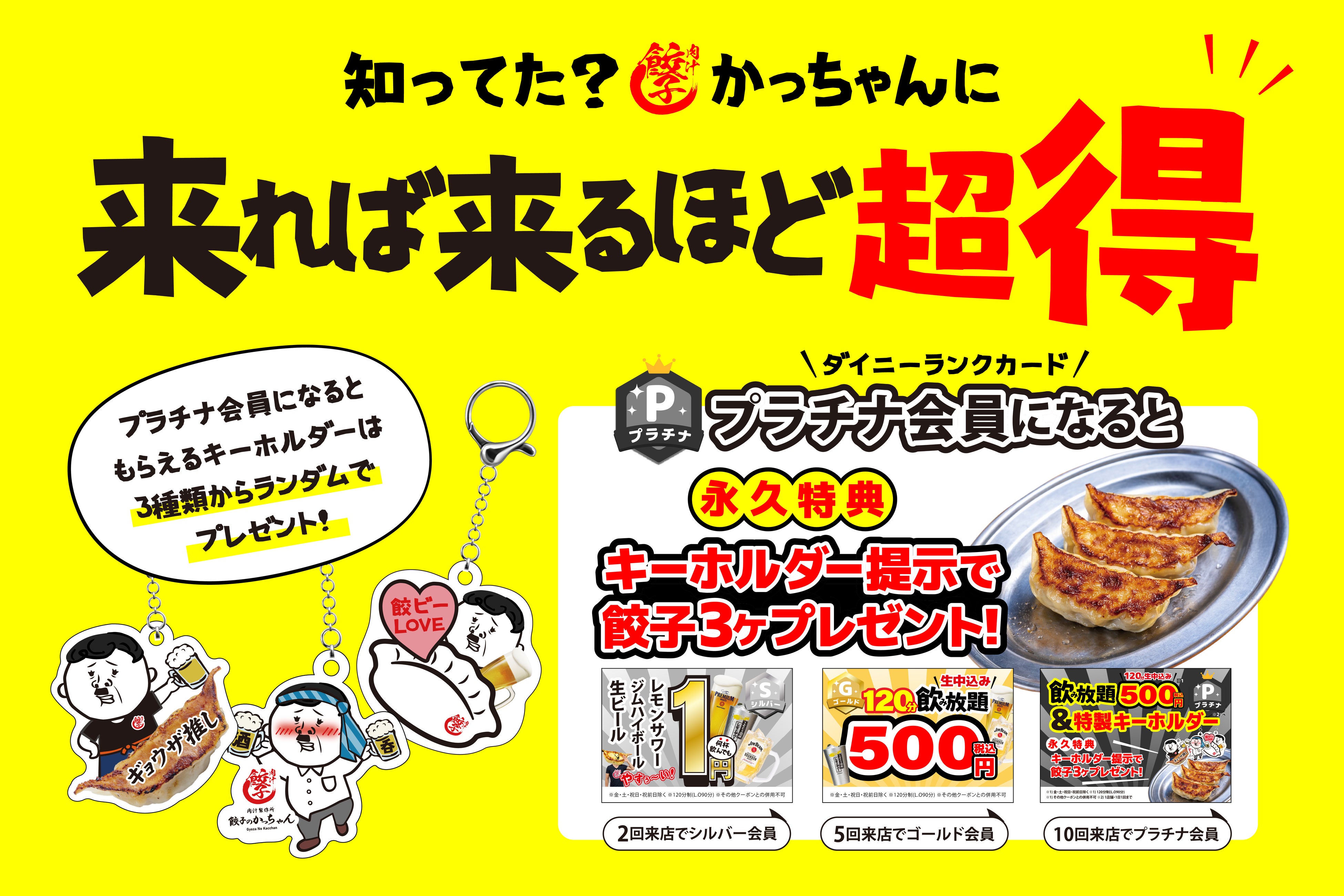 ご来店時にこのキーホルダーをご提示いただくと、看板メニューの「かっちゃん餃子(3個)」が毎回1皿無料になります!(※1日1回まで)