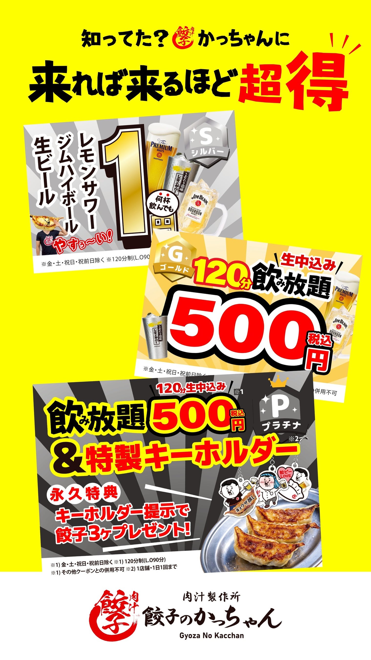 圧倒的なコストパフォーマンスと活気あふれる店内でご好評いただいている「餃子のかっちゃん」。この度、日頃からご愛顧いただいているリピーターのお客様へさらなる還元を目指し、モバイルオーダーシステム「dinii(ダイニー)」を活用した新たなランクカード制度を開始します。 ご来店時のチェックイン回数に応じて「シルバー」「ゴールド」「プラチナ」とランクアップし、達成ごとに超お得な特別クーポンや限定グッズをプレゼントします。
