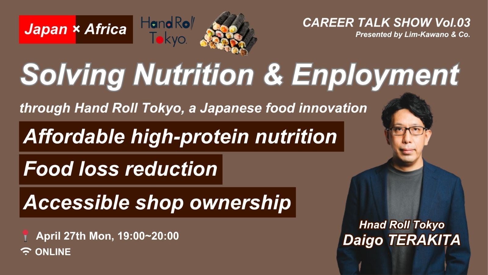 株式会社kamibito(本社:東京都新宿区、代表取締役:寺北大悟)が運営する、Google口コミ評価4.7の人気巻き寿司専門店「Hand Roll Tokyo」は、2026年4月27日(月)19:00より、LIM-KAWANO & Company Inc.様主催のもと、日本在住のアフリカ人留学生向けオンラインプレゼンテーション『JAPAN×AFRICA CAREER TALK SHOW Vol.03』を開催いたします。 最大200名が参加予定の同イベントでは、日本のファストフード「Sushi」を通じたアフリカの社会課題解決と、留学生の帰国後の起業支援について、代表の寺北が登壇しお話しいたします。また当店は、今年中にブランド2店舗目にして初の海外店舗となるイギリス・サウサンプトンへのオープンも決定しており、本ウェビナーを皮切りに食を通じたグローバルな社会変革をさらに加速させていきます。