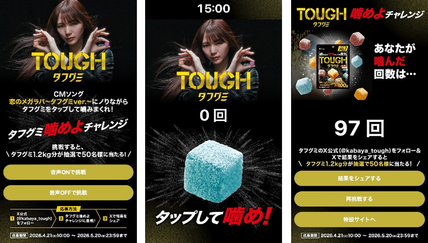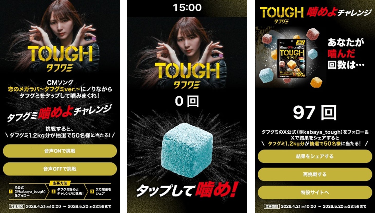 本キャンペーンは、X上で実施します。画面上の『タフグミ』を連打して遊ぶミニゲームで、『タフグミ』の特長である“高弾力食感”を楽しみながら体感いただける内容となっています。『タフグミ』公式Xアカウントをフォローの上、本ゲームに挑戦し、結果をシェアすることで応募が可能です。