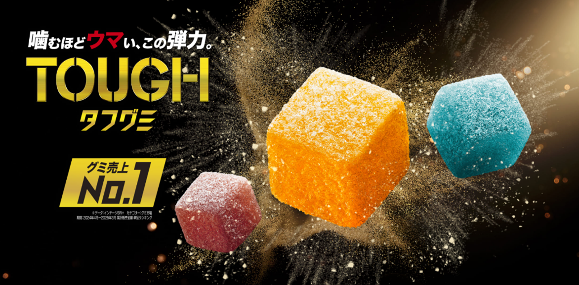 『タフグミ』は、“噛むほどウマい、この弾力。”というコピーが表す通り、「噛みごこちの良い高弾力食感」「大粒」「サワーパウダーの刺激」が生み出す唯一無二の“噛み続けたくなる、やみつきのウマさ”が特長です。