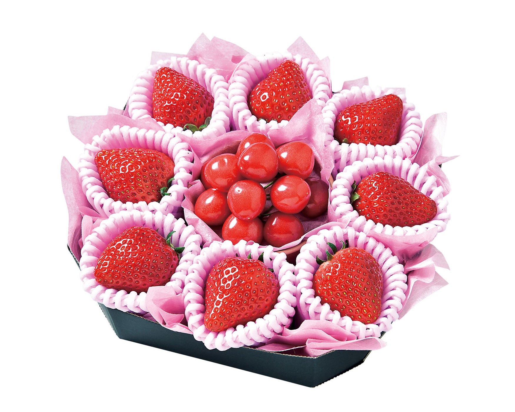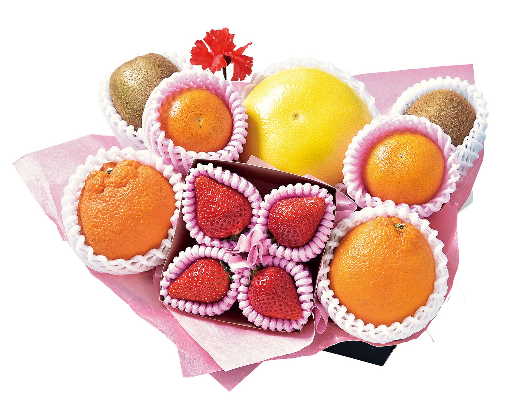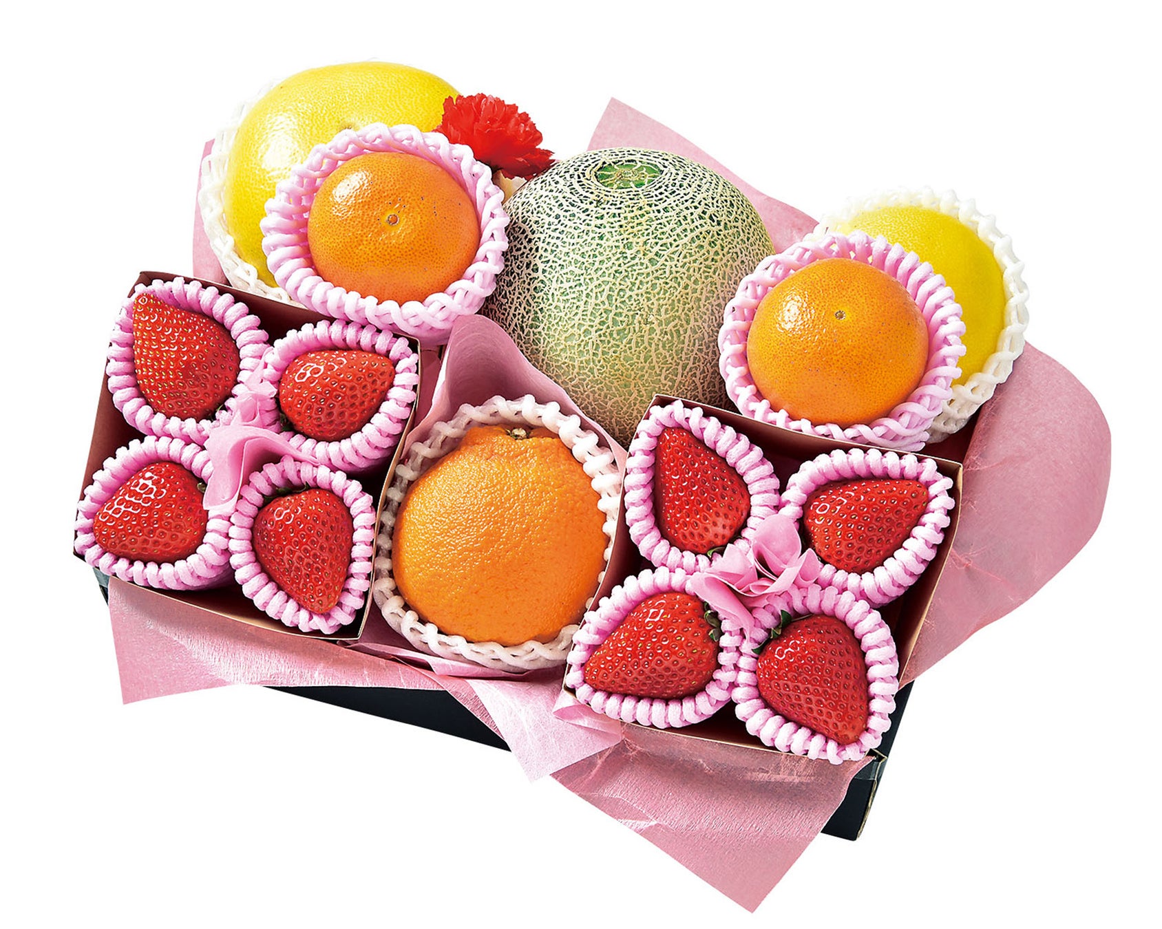 「母の日フルーツギフトA」は、いちごをメインに、メロン、デコポン、なつみ、ニューサマーオレンジ、美生柑を詰め合わせた人気商品です。本商品は、肌のコラーゲン生成を助ける効果や、細胞の老化を防ぐ効果を持つビタミンCを豊富に含むフルーツを中心に構成しています。様々な柑橘の食べ比べも楽しめる商品です。