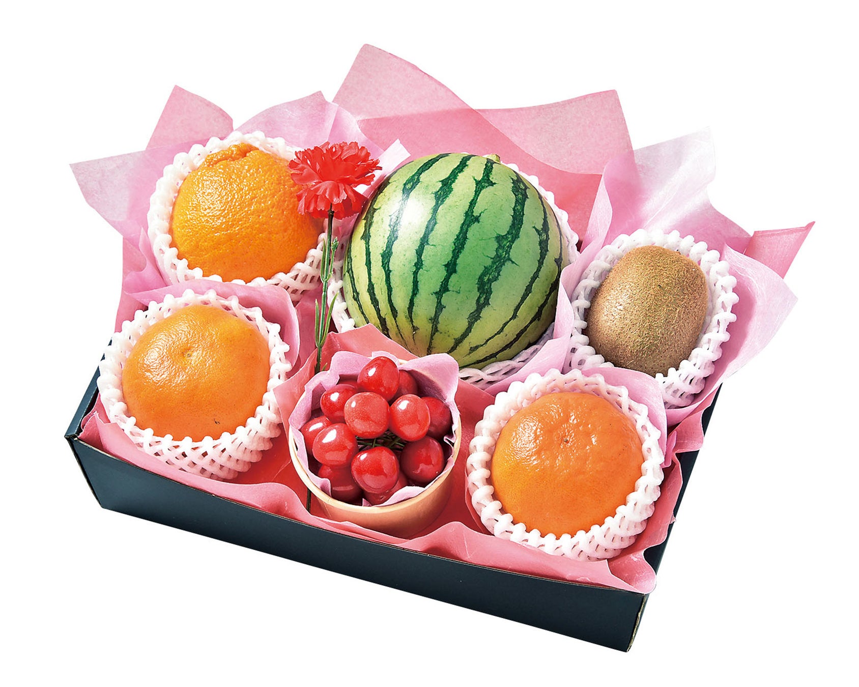 「母の日フルーツギフトB」は、さくらんぼをメインに“旬を先取り”をテーマにした商品で、小玉スイカ、デコポン、サンゴールドキウイ、なつみを詰め合わせました。スイカやさくらんぼに多く含まれるカリウムは、体内の余分なナトリウム排出やむくみの解消を助ける効果を持つ栄養素で、健康に気遣う贈り物としてもおすすめです。