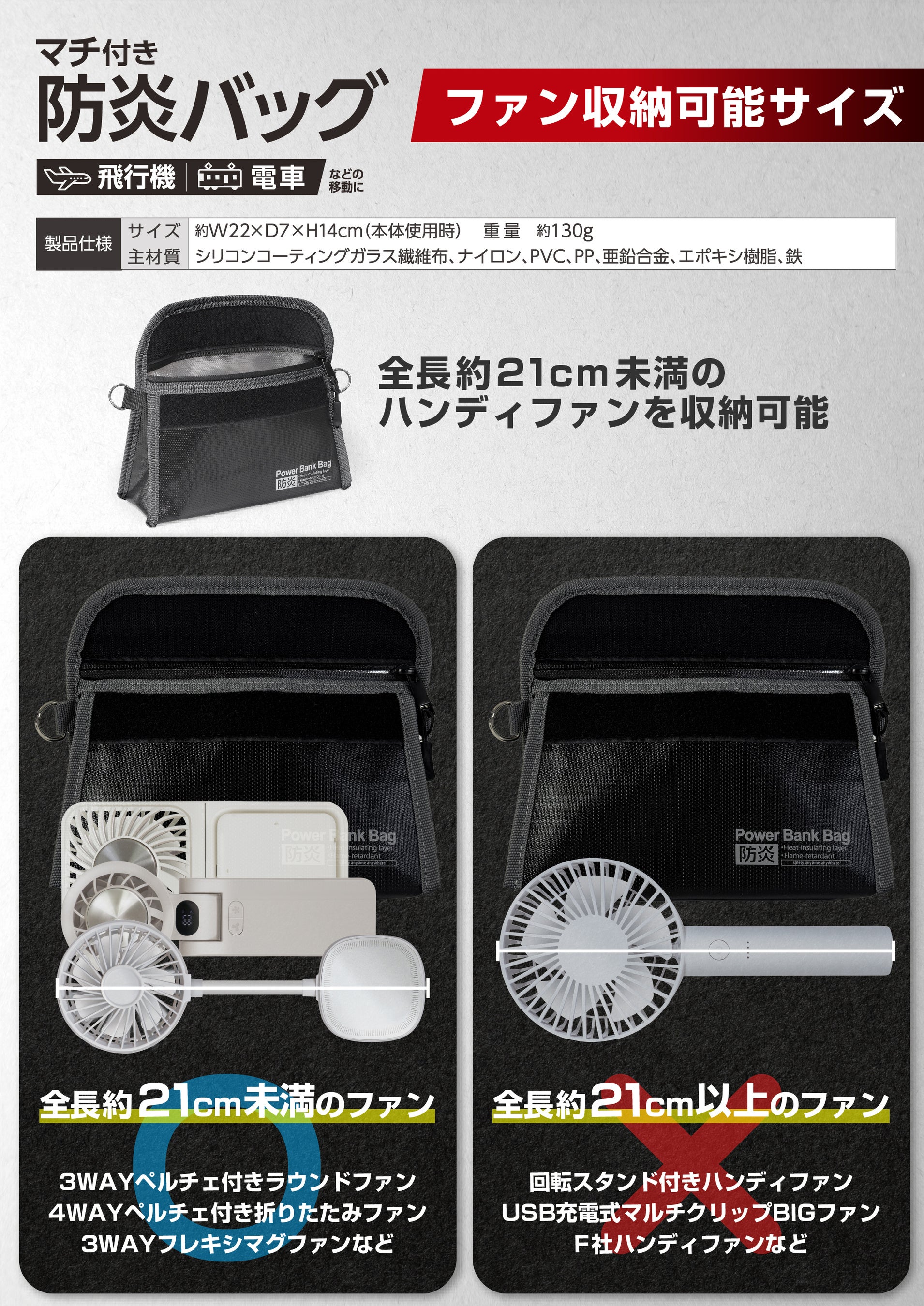 特徴:飛行機や電車、もしもの時の発火リスク対策に!モバイルバッテリーなどの電子機器の炎上を最小限に抑える防炎バッグです。マチ付きで余裕のある収納力と、ショルダーストラップを取り付け可能なDカン付きで携帯性が抜群。1,000℃のバーナーで2分間加熱する国内耐火テストを実施。バッグの素材には、耐火性が高く特殊加工された「ガラス繊維布(グラスファイバークロス)」を2重構造で使用しています。