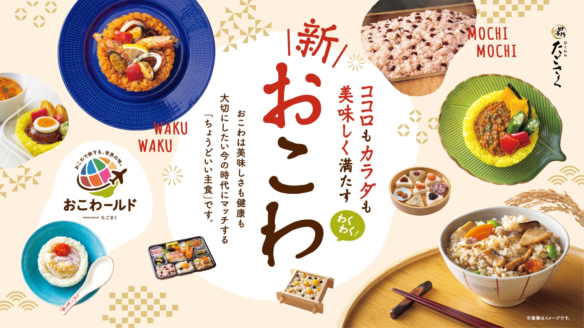 株式会社グリーンハウスフーズが展開するおこわ専門店「たごさく」は、世界各国の料理をモチーフにした、新たなラインアップである「おこわールド」を中心に、もち米を使用した新商品を4月22日(水)にオープンする「ペリエ稲毛」店限定で販売開始いたします。