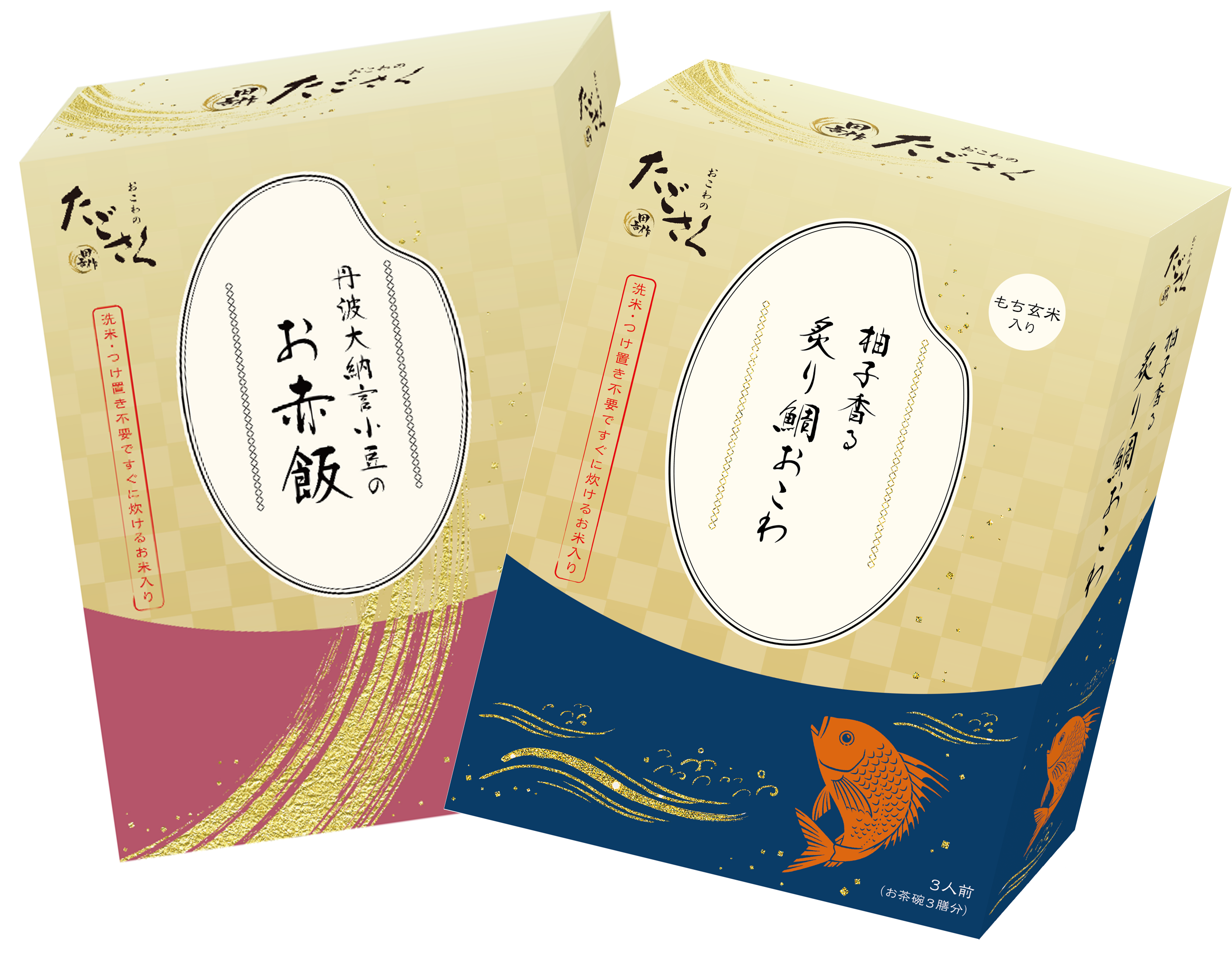 「たごさく」では、炊飯器で手軽におこわが炊ける、もち米100%の「お家でおこわ」シリーズも展開しています。洗米、つけ置きが不要で、最短約20分での調理が可能です。王道の「丹波大納言小豆のお赤飯」と、上品な味わいの「柚子香る 炙り鯛おこわ」の2種類をご用意しています。