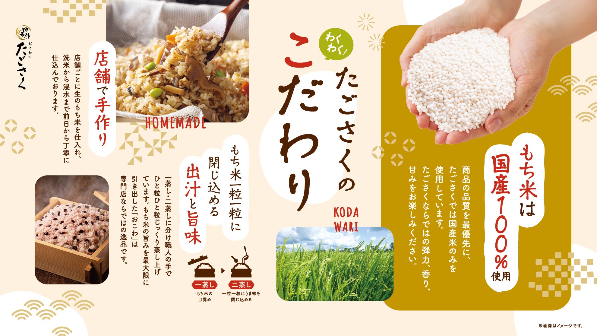 1966年に創業した「たごさく」は、全国の商業施設を中心に展開し、日本伝統の食文化である彩り豊かな四季の「おこわ」を時代の嗜好に合わせてお届けしてまいりました。