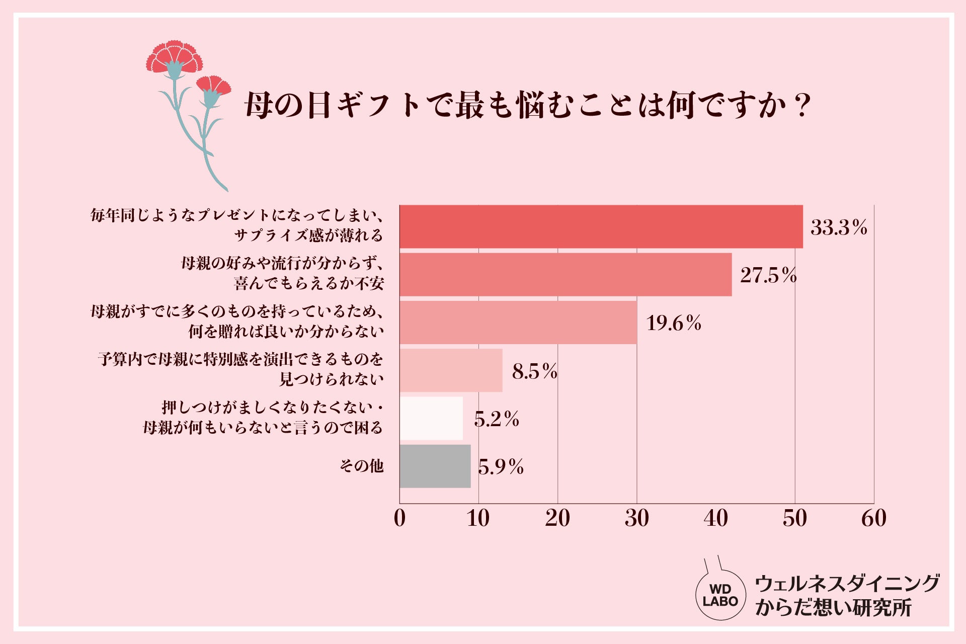 ウェルネスダイニング株式会社(本社:東京都墨田区、代表取締役:中本哲宏)は、全国300名を対象に「母の日に関する調査」を実施しました。