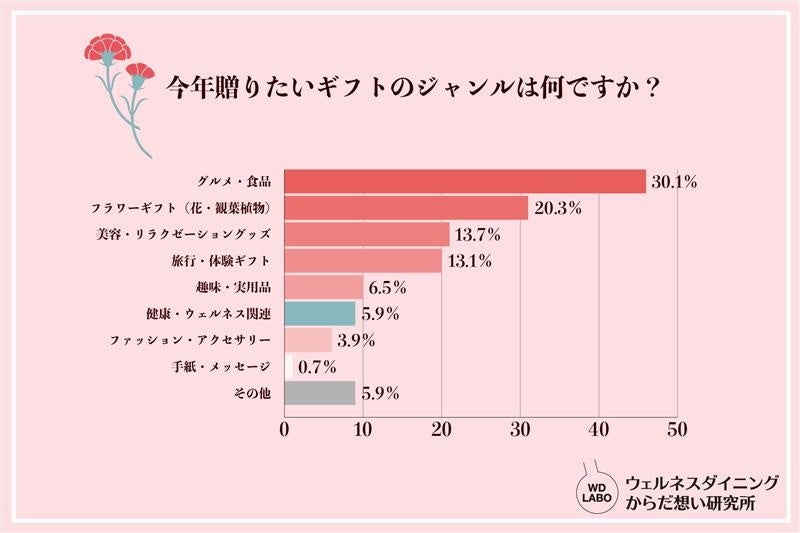 母の日ギフトに贈りたいジャンルの1位は「グルメ・食品」(30.1%)となった一方、「母親の健康を想って気軽に贈れるギフトがあれば利用したい」と回答した人は合計68.3%にのぼりました。