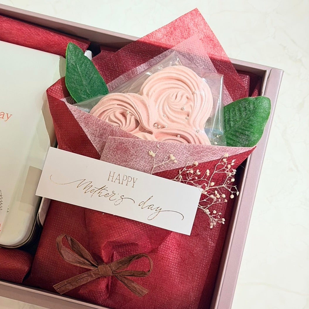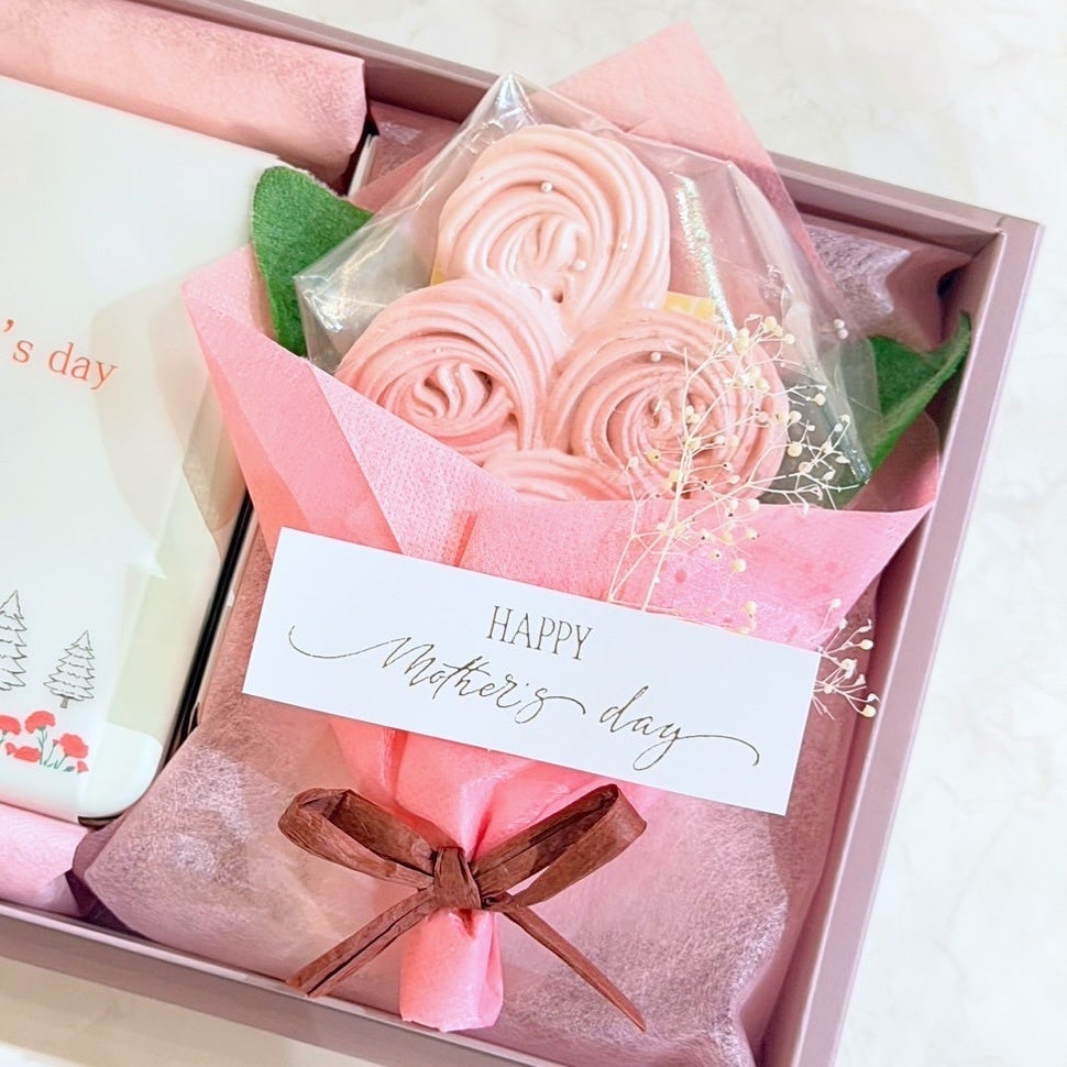 今年は、お母様への感謝をより特別に演出するため、ギフトボックスをピンクグレー&ゴールドリボンにリニューアル。さらにメレンゲの「食べられる花束」も華やかさを増し、記憶に残るスイーツギフトに仕上げました。