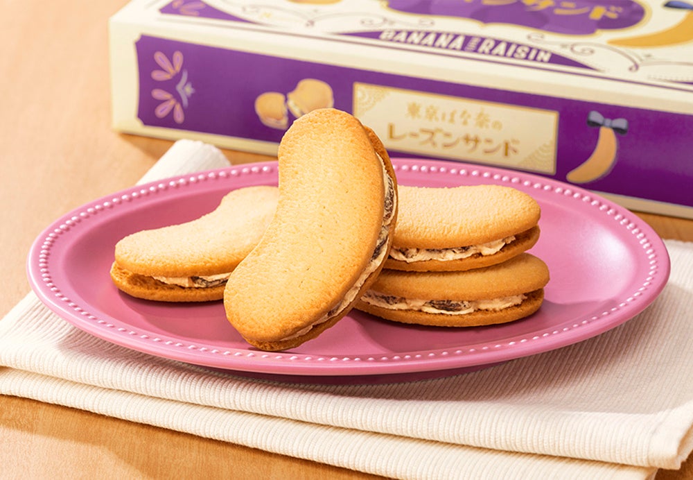 東京ばな奈総選挙(※)第1位を獲得した⾃慢のレーズンサンドが進化しました。ほんのりバナナが香るホワイトショコラクリームに、ぎゅっと甘みを凝縮させたジューシーなラムレーズン。東京ばな奈の形のクッキーでサンドしました。