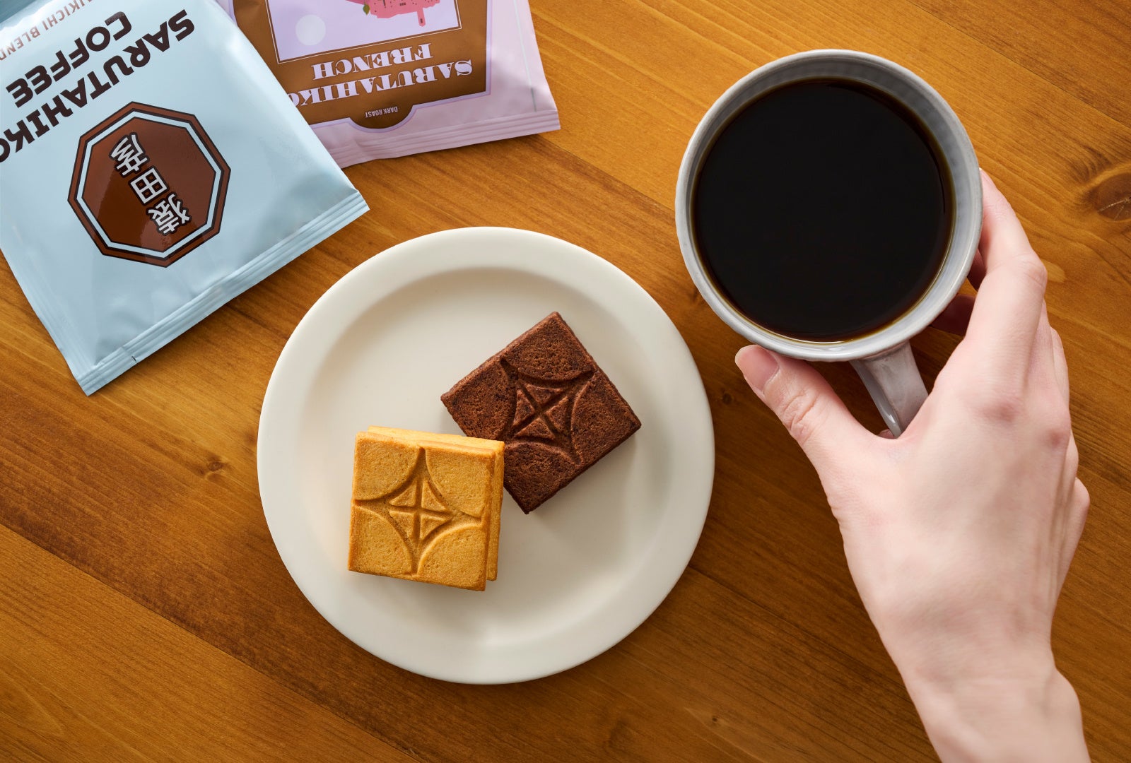 深煎りの「猿田彦フレンチ」は、赤ワインのピノ・ノワールや生チョコレートを思わせるような、滑らかな舌触りの奥行きのある味わい。濃厚でありながらも重たすぎないリッチな味わいがバターサンドのおいしさと重なり、上品で洗練された余韻をお楽しみいただけます。