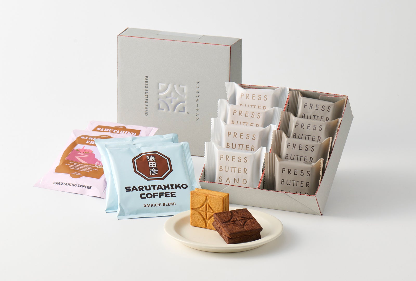 猿田彦珈琲のバリスタとPRESS BUTTER SANDの商品企画担当者がセレクトした、ペアリングを楽しめる本セット。バターサンドの定番2種類を詰め合わせた「バターサンド2種詰合せ〈チョコレート〉8個入」と、猿田彦珈琲の定番で深煎りの「猿田彦フレンチ」「大吉ブレンド」のドリップバッグが各2枚ずつのセットです。