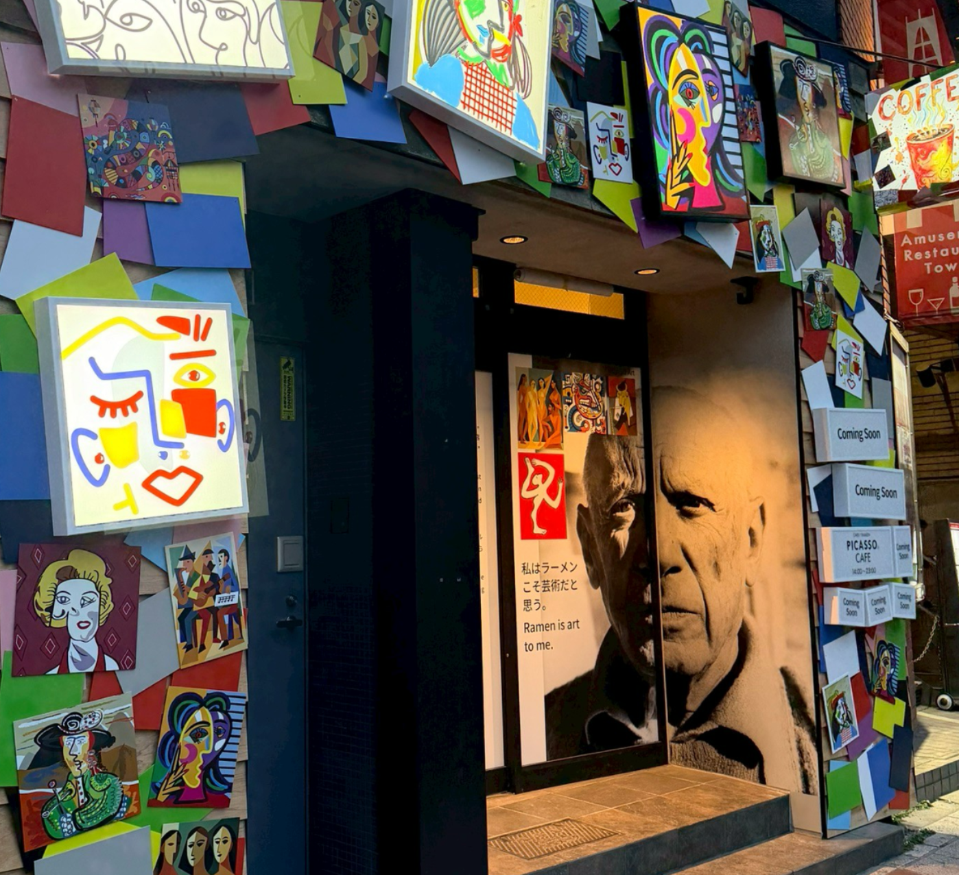 世界的巨匠パブロ・ピカソのインスパイアアートと、大阪で週末50人以上の行列を作り続ける「人類みな麺類」の革新性が融合した新業態のカフェです。店内には様々なアート作品が飾られ、店内中央には本格的なDJブースもあり、アートに囲まれた空間で様々なカフェフードやドリンクに加えて本格的なラーメンをお楽しみいただけます。